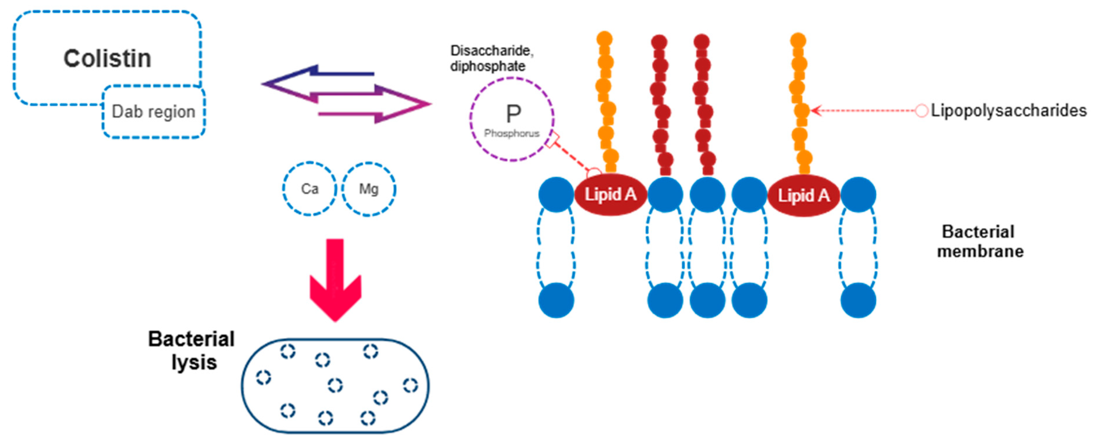 - Pogue, J.M.; Mills, J.P.; Kaye, K.S. Polymyxins (Polymyxin B and Colistin). In Mandell, Douglas, and Bennett’s, Principles and Practice of Infectious Diseases, 19th ed.; Blaser, M., Cohen, J., Holland, S., Doi, Y., Falsey, A., Garrett, W., Eds.; Elsevier Co.: Philadelphia, PA, USA, 2026; pp. 423–427. [Google Scholar]
