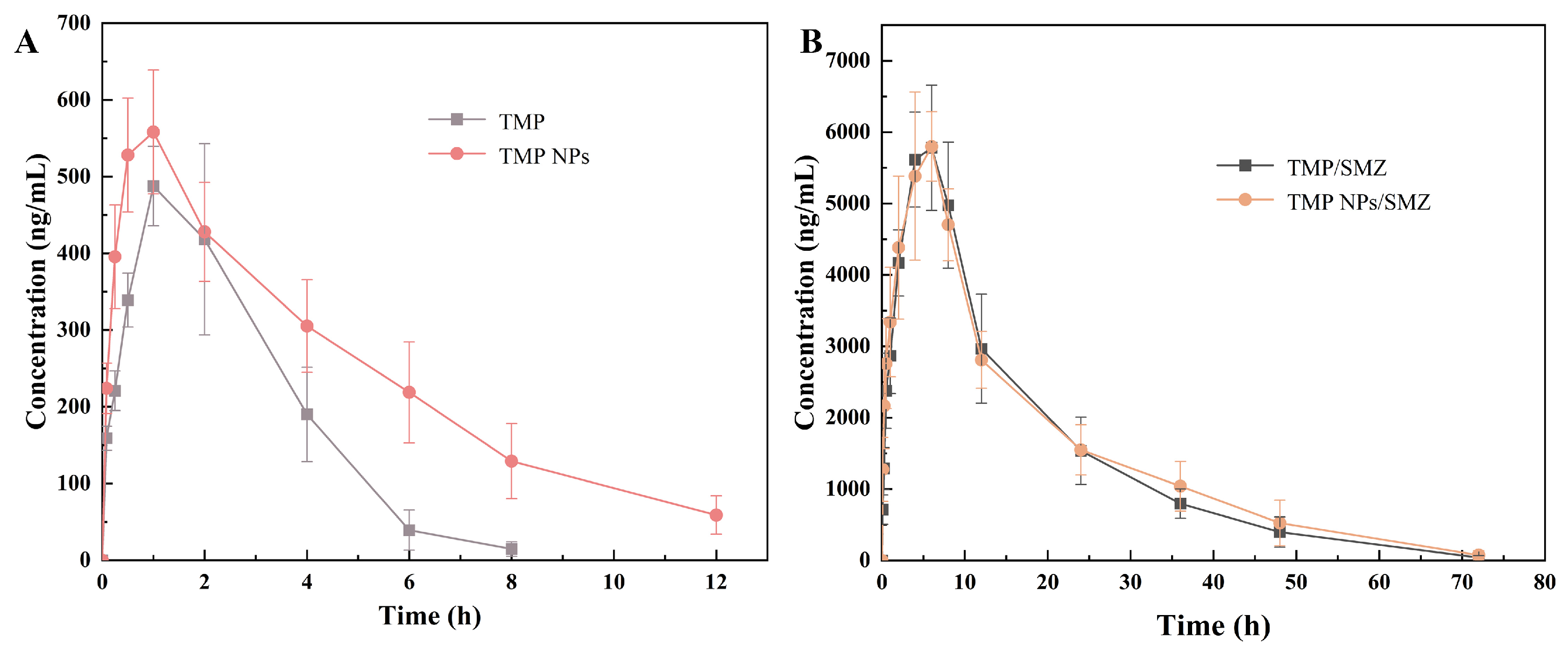 2.2. Pharmacokinetics and Oral Bioavailability of TMP NPs/SMZ