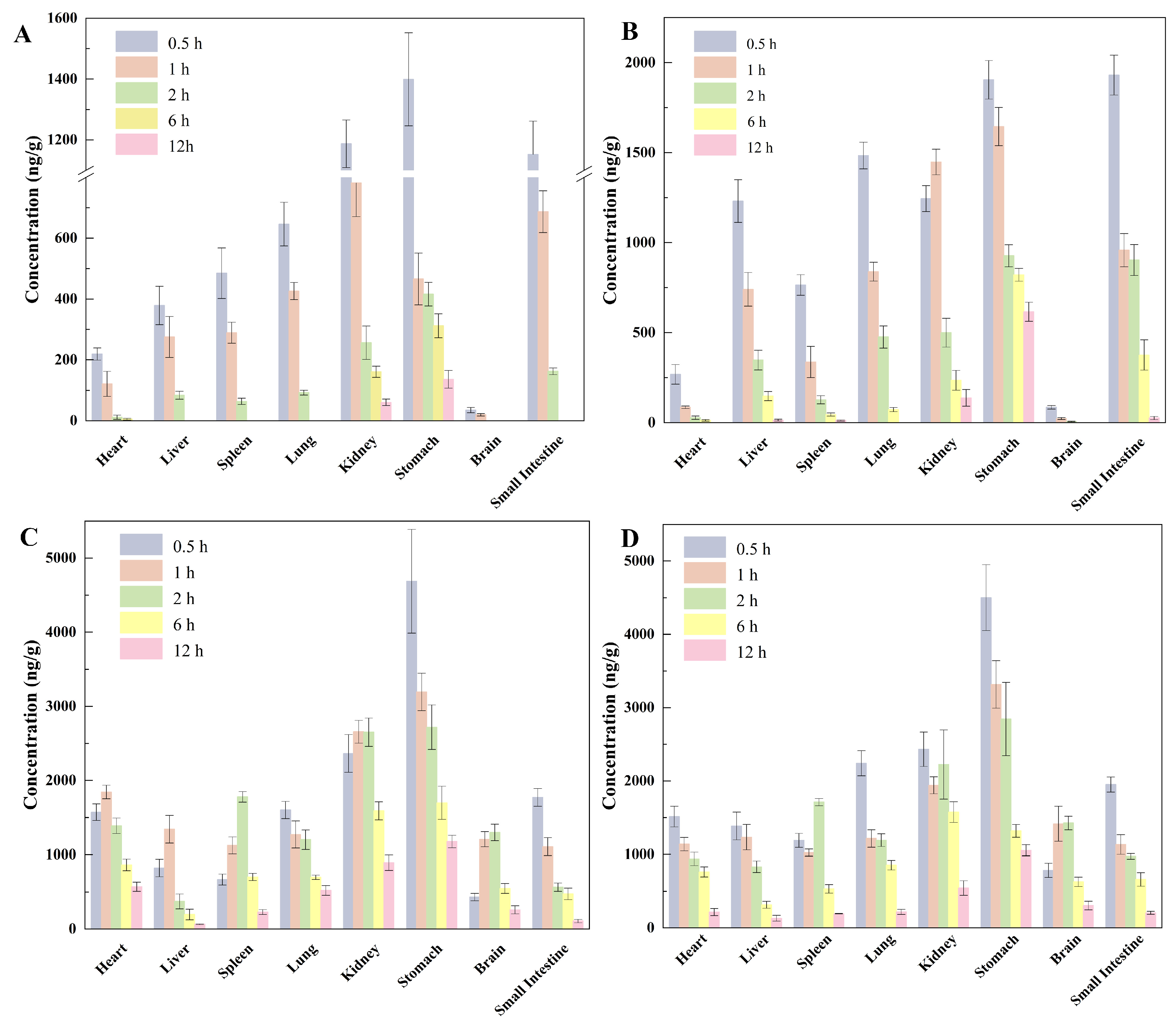 | Stomach | Y = 0.00986X − 0.00428 | 0.99478 | 20–1000 | 20 | 5 |