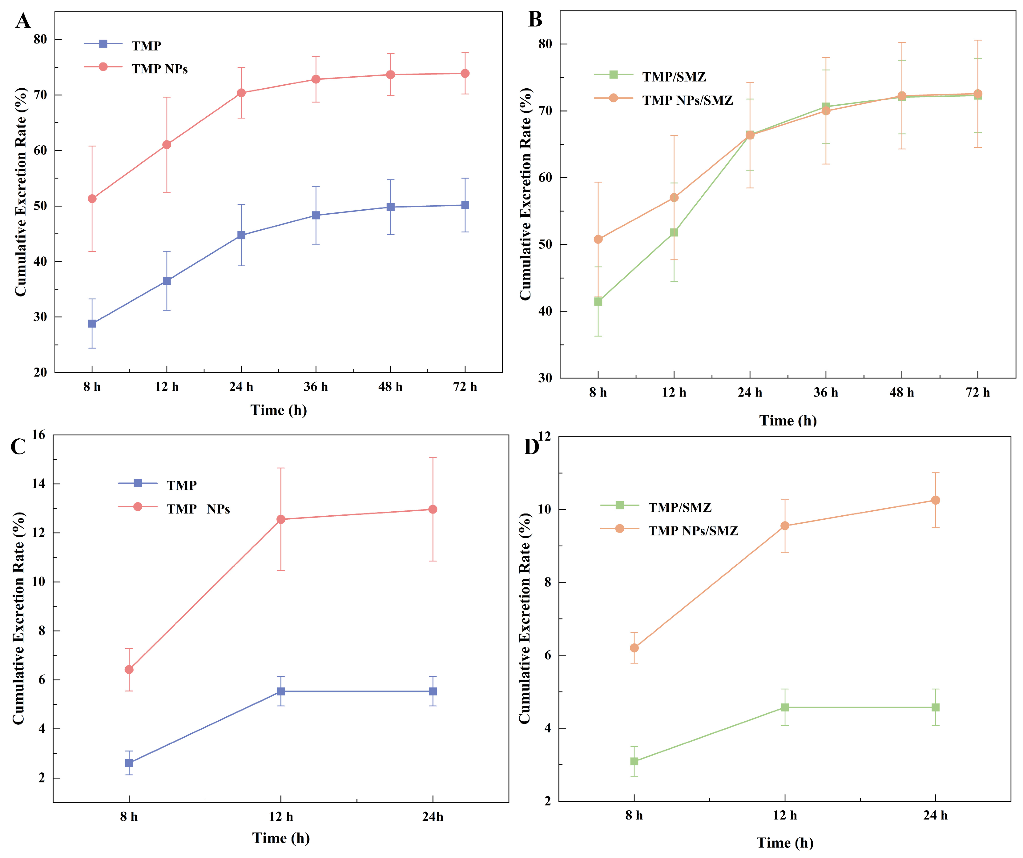 2.4. Urinary and Fecal Excretion Characteristics of TMP NPs/SMZ