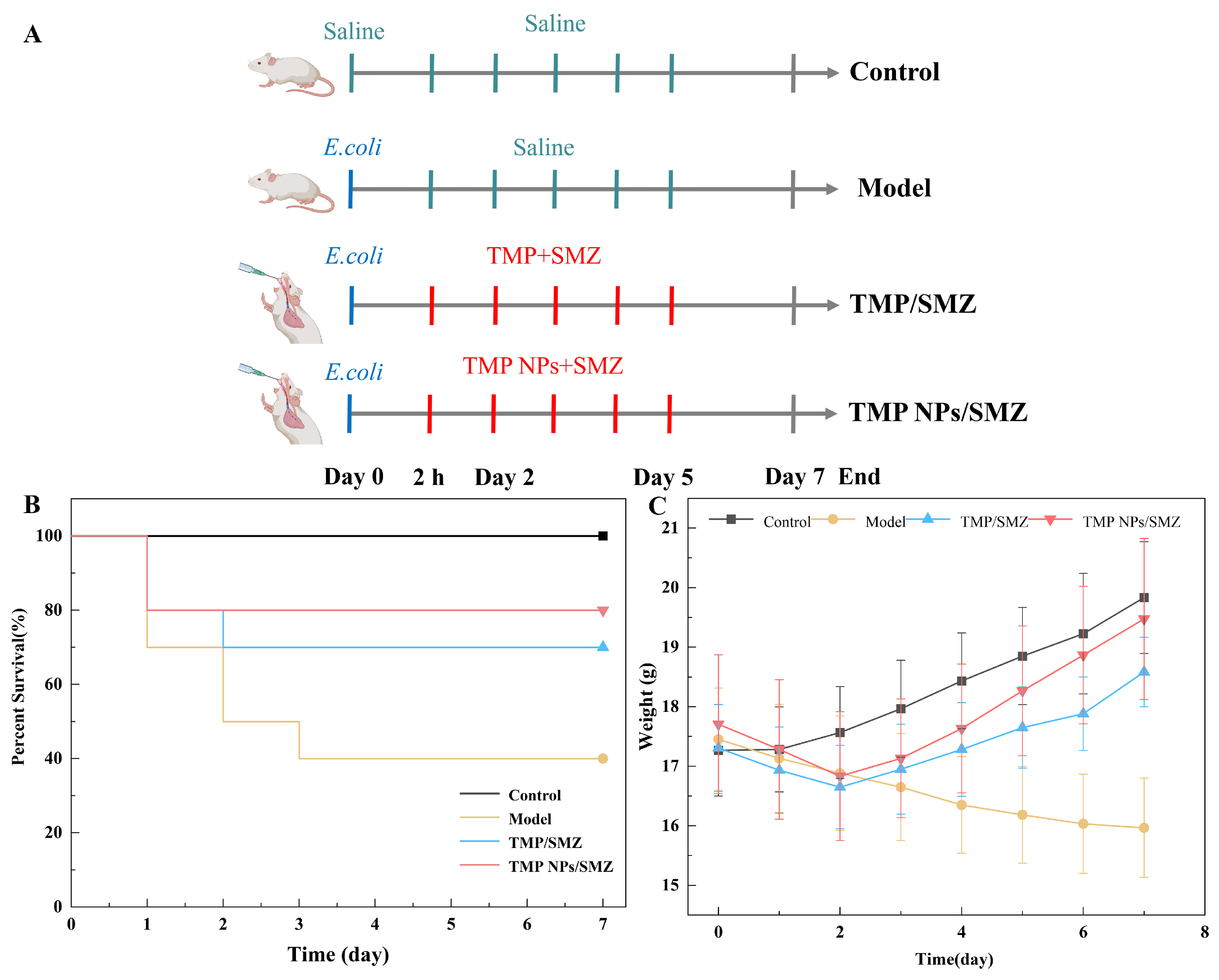4.8.1. Therapeutic Efficacy of Oral TMP NPs/SMZ Against Intraperitoneal E. coli Infection