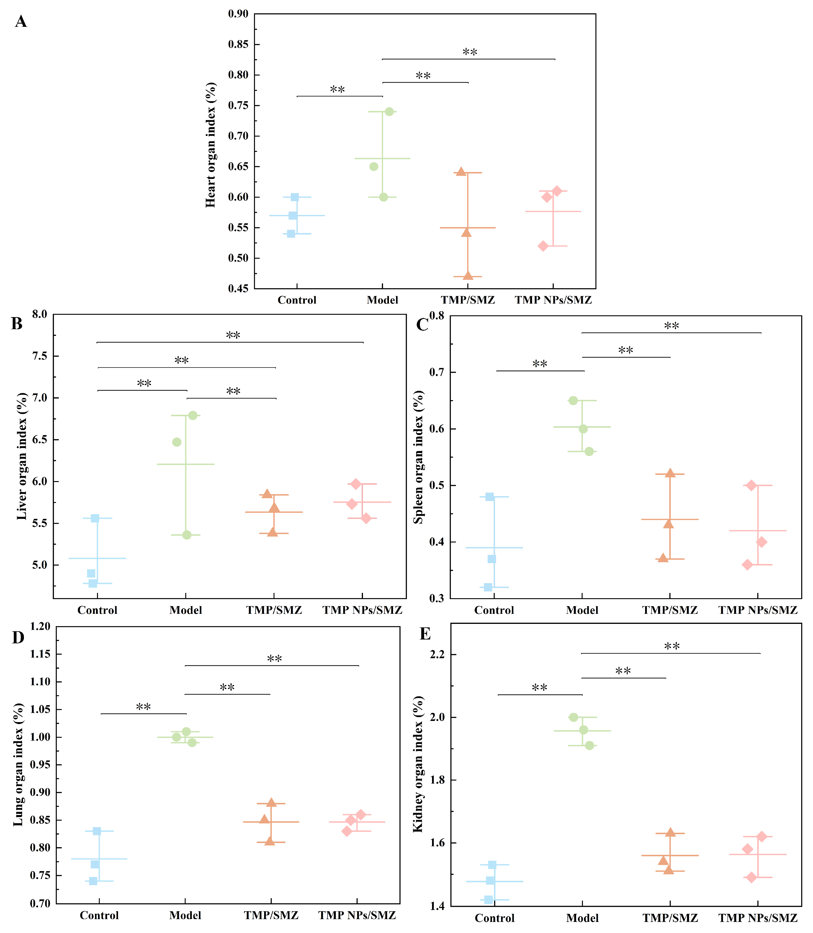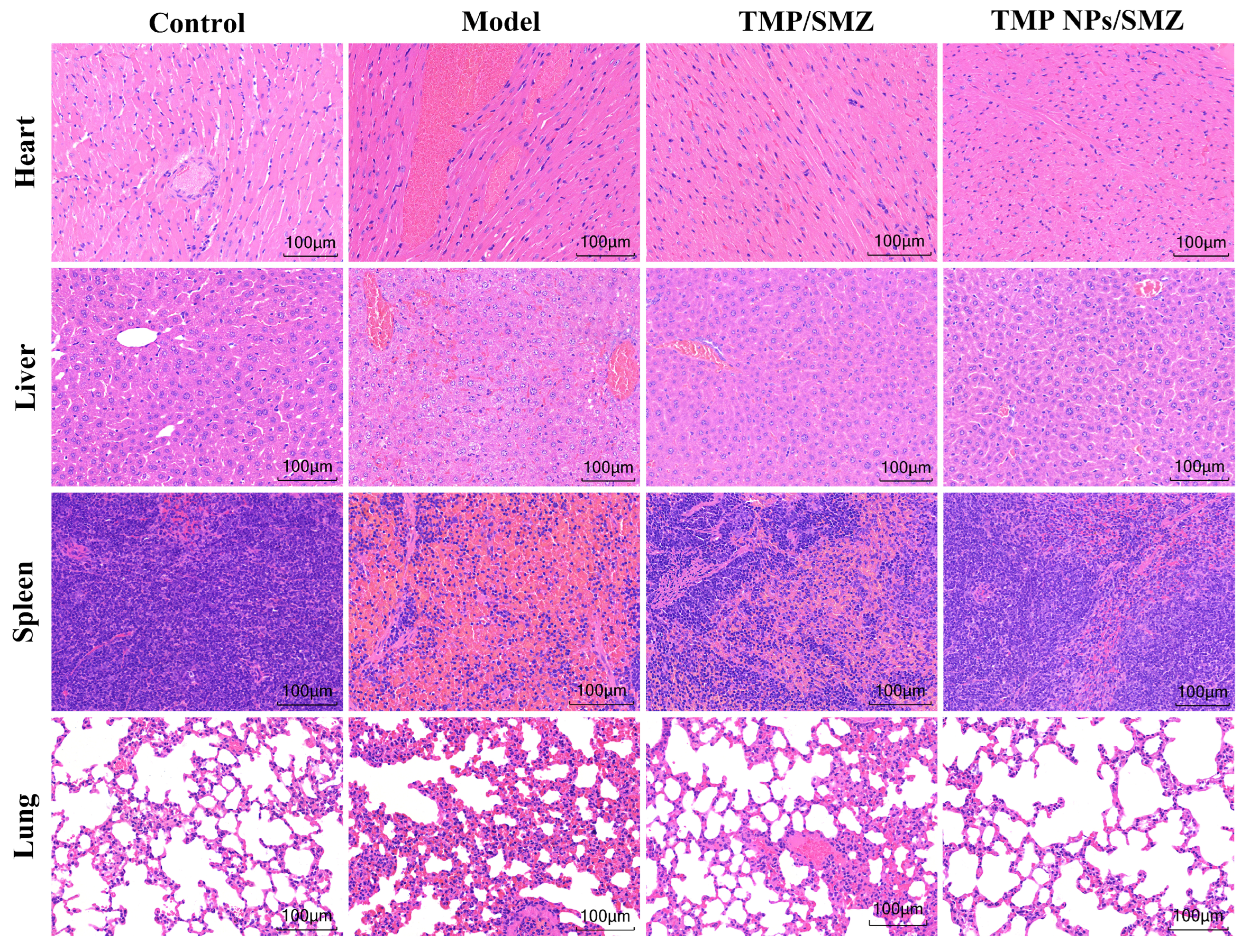 2.3. Tissue Distribution Characteristics of TMP NPs/SMZ