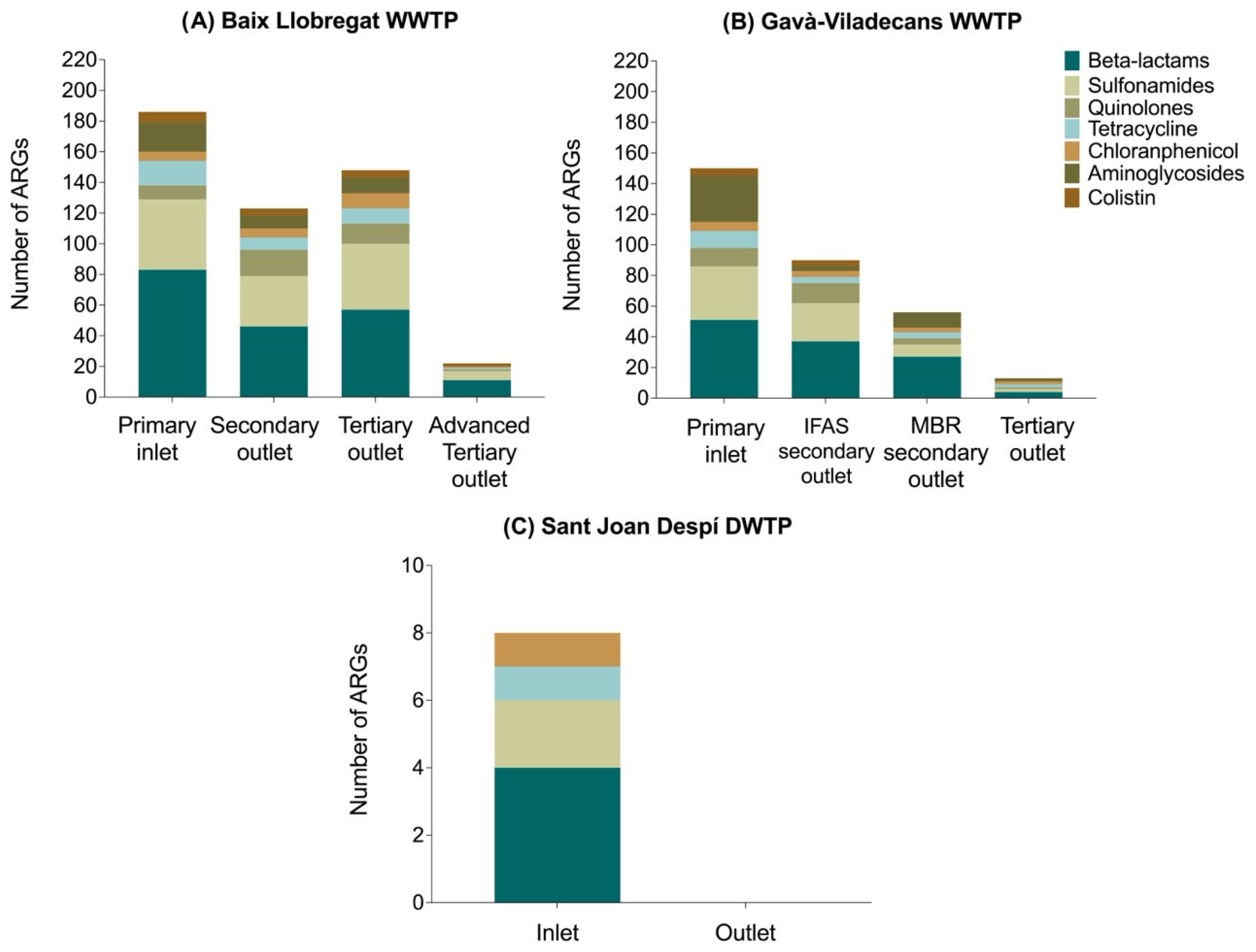 - Ballén, V.; Mondéjar, L.; Gabasa, Y.; Castellsagués, L.; Alcalde-Rico, M.; Pinar-Méndez, A.; Vilaró, C.; Galofré, B.; Soto, S.M. Integrated metagenomic, culture-based, and whole genome sequencing analyses of antimicrobial resistance in wastewater and drinking water treatment plants in Barcelona, Spain. Int. J. Hyg. Environ. Health 2025, 270, 114664. [Google Scholar] [CrossRef]