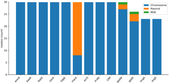 n = 116), we detected 82 distinct resistance determinants (5433 total occurrences), featuring a conserved chromosomal backbone enriched for intrinsic multidrug resistance components and lipid A modification pathways, alongside common plasmid- and MGE-associated acquired ARG modules involving tetracycline (