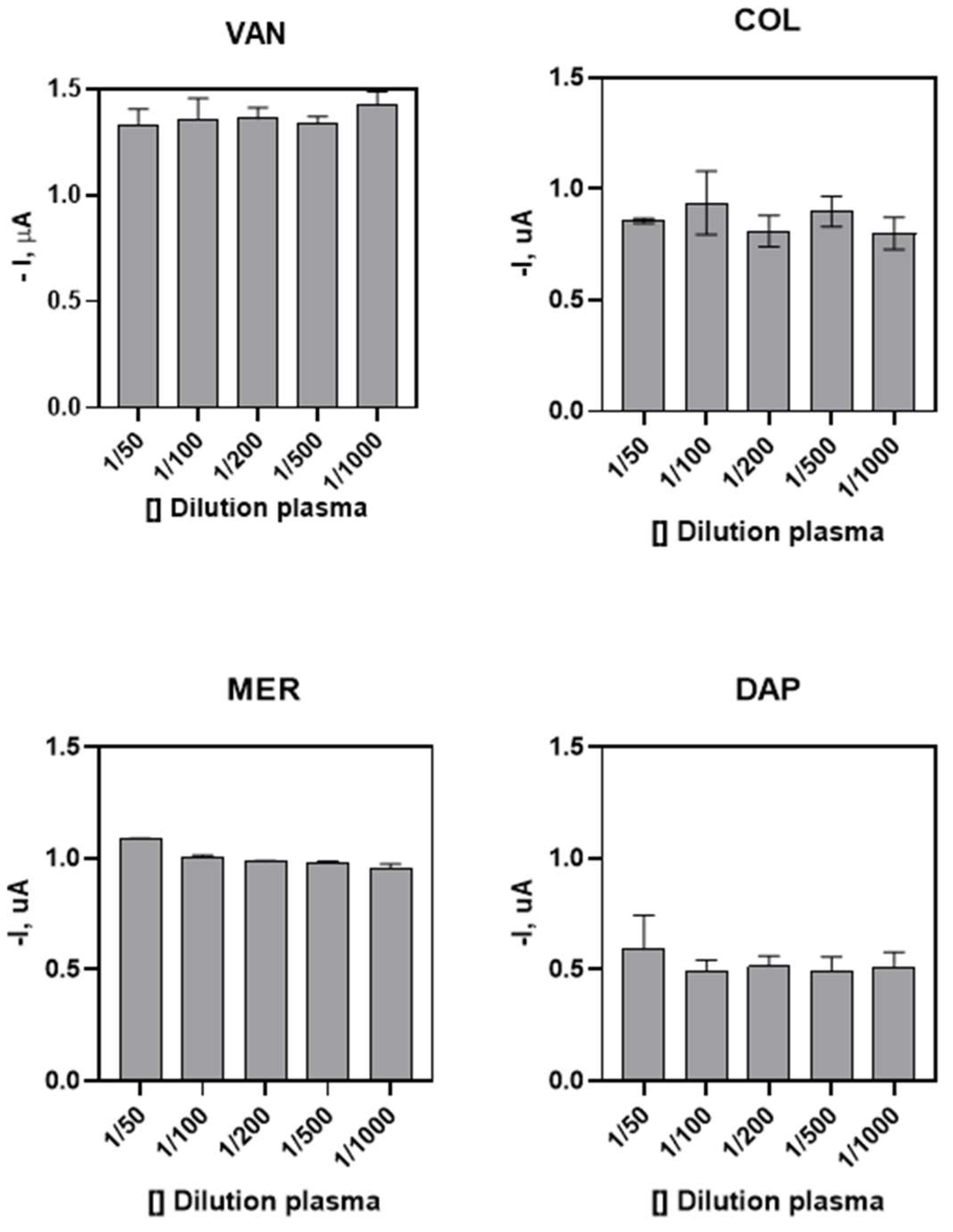 | Antibiotic | -Imin µA | -Imax µA | Slope | IC50 Diluted Plasma nM (µg/L) | IC50 Pure Plasma nM (µg/L) | LOD Diluted Plasma nM (µg/L) | LOD Pure Plasma nM (µg/L) |