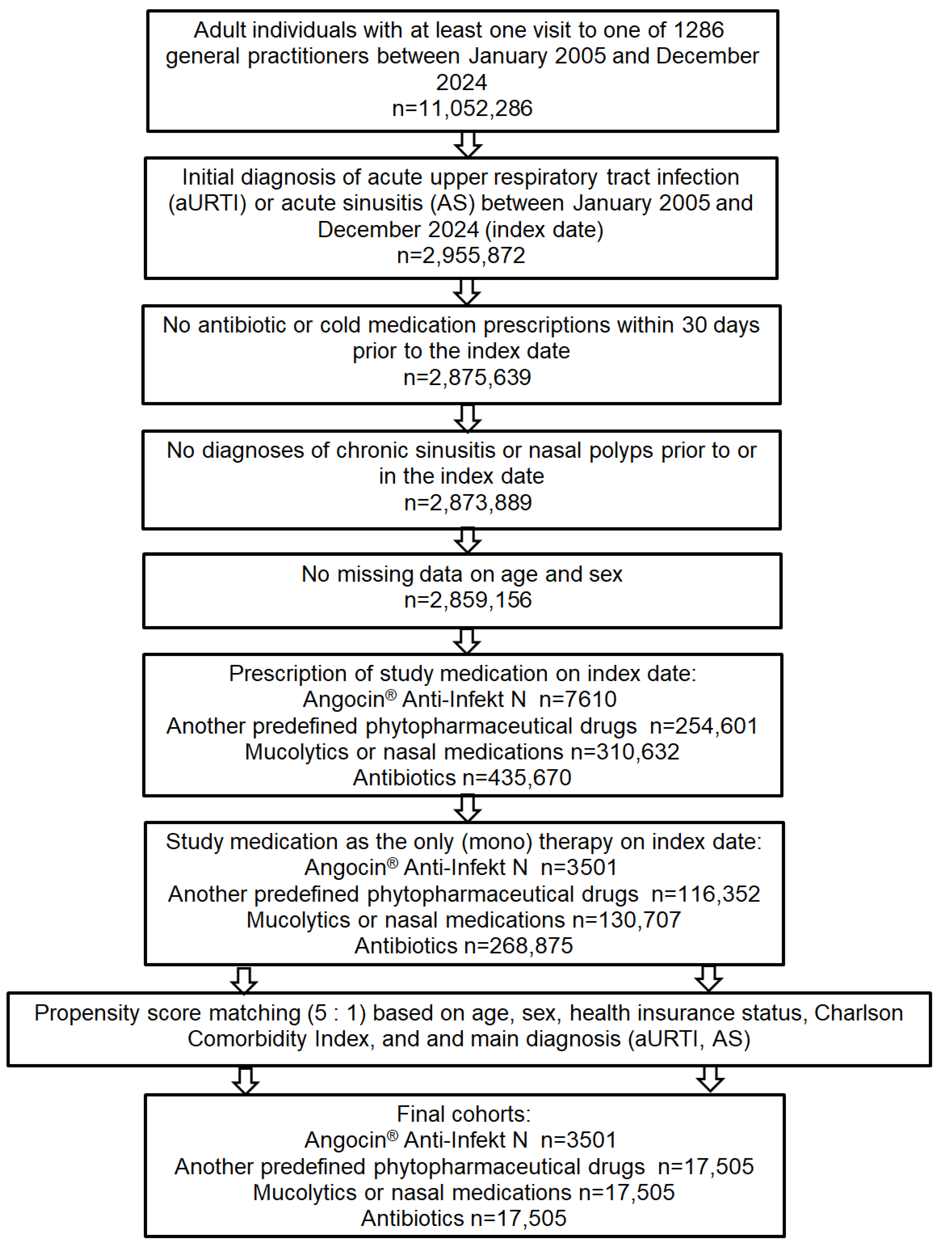Patients were eligible for inclusion if they were treated in outpatient primary care in Germany and had at least one documented diagnosis of an acute upper respiratory tract infection (aURTI) including sinusitis according to the “International Statistical Classification of Diseases and Related Health Problems” ICD code (ICD-10: J01: Acute sinusitis, J06: Acute upper respiratory infections of multiple and unspecified sites) from January 2005 to December 2024. Patients with a first documentation of one of the upper respiratory tract infections were categorized into one of four cohorts according to the “Anatomical Therapeutic Chemical” (ATC) classification system based on the prescription of defined therapy on the day of the diagnosis: