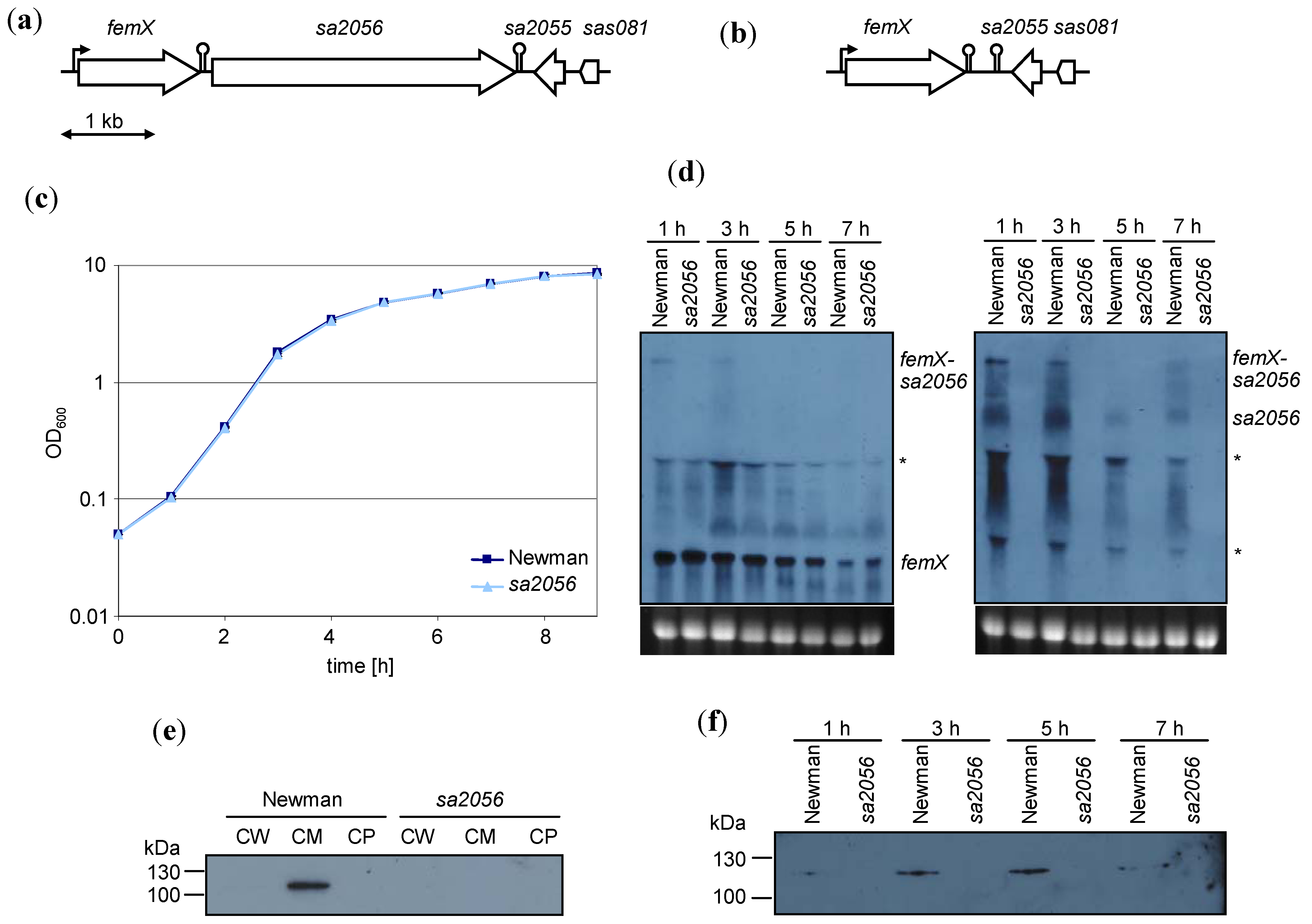 Expression of sa2056 in strain Newman and its sa2056 mutant. Genetic organization of the femX-sa2056 region in (a) the wild-type and (b) the sa2056 mutant. Construction of the sa2056 mutant is detailed in supplementary figure S1. (c) Growth curves from Luria-Bertani broth (LB) cultures monitored during 9 h. (d) Northern blot analyses of RNA samples taken after 1, 3, 5 and 7 h of growth. Digoxigenin (DIG)-labeled probes for femX (left panel) and sa2056 (right panel) were used. Relevant bands are indicated. Ethidium bromide-stained 16S rRNA is shown as an indication of RNA loading. Bands that might be caused by interference of bulk 16S and 23S rRNA are designated by asterisks. Specific antibodies against SA2056 (114.7 kDa) were used for Western blot analyses of (e) cell wall (CW), cell membrane (CM) and cytoplasmic (CP) fractions isolated from exponentially growing cells and (f) membrane preparations from samples taken after 1, 3, 5 and 7 h of growth.