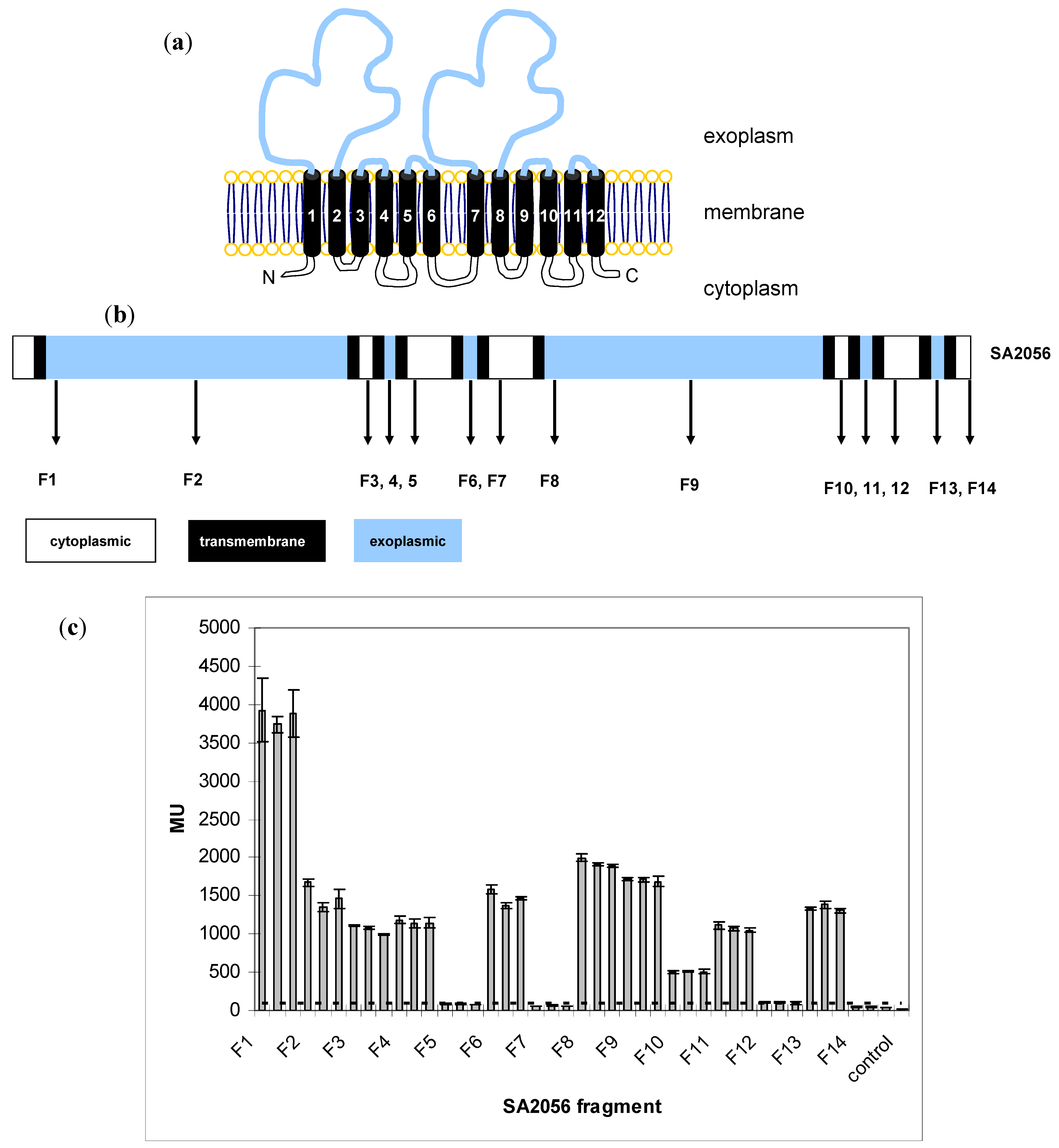 Analysis of SA2056 topology. (a) Model of SA2056 topology depicting cytoplasmic (white), membrane (black) and exoplasmic (blue) segments. The N- and C-terminus of the protein are both predicted to be located in the cytoplasm. (b) SA2056 fragments F1–14 cloned to the N-terminus of PhoA. (c) Activity of fusion proteins was measured in biological and technical triplicates; mean values for each clone are given, and the standard deviation is indicated. SA2056 fragments directing PhoA to the exoplasm were expected to produce values at least five times higher than the background levels (dashed line) measured in the phoA-negative E. coli strain CC118 (control).