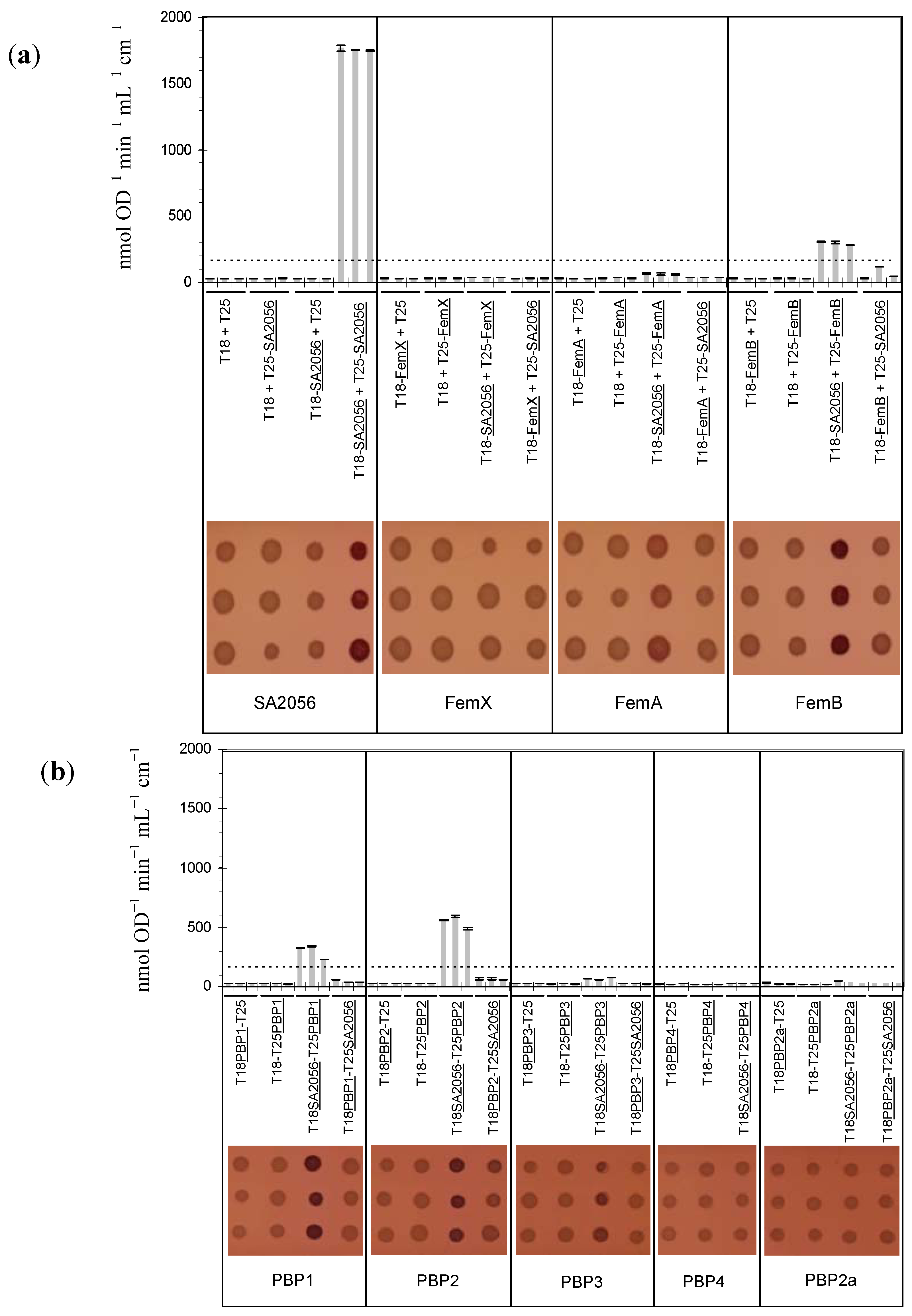 SA2056 interactions determined using the bacterial two-hybrid system. (a) SA2056 interactions with itself and the FemABX factors. (b) SA2056 interactions with penicillin binding proteins (PBPs). Three representative co-transformants containing the plasmids indicated were analyzed regarding β-galactosidase activity, which was determined by measuring the formation of o-nitrophenol (top). Means of three technical replicates and their standard deviation are shown. The threshold corresponding to the highest negative control value multiplied by five is indicated by a dashed line. Alternatively, the ability of co-transformants to degrade lactose to lactate was tested on MacConkey agar (bottom), where acidification of the medium leads to pink colonies.