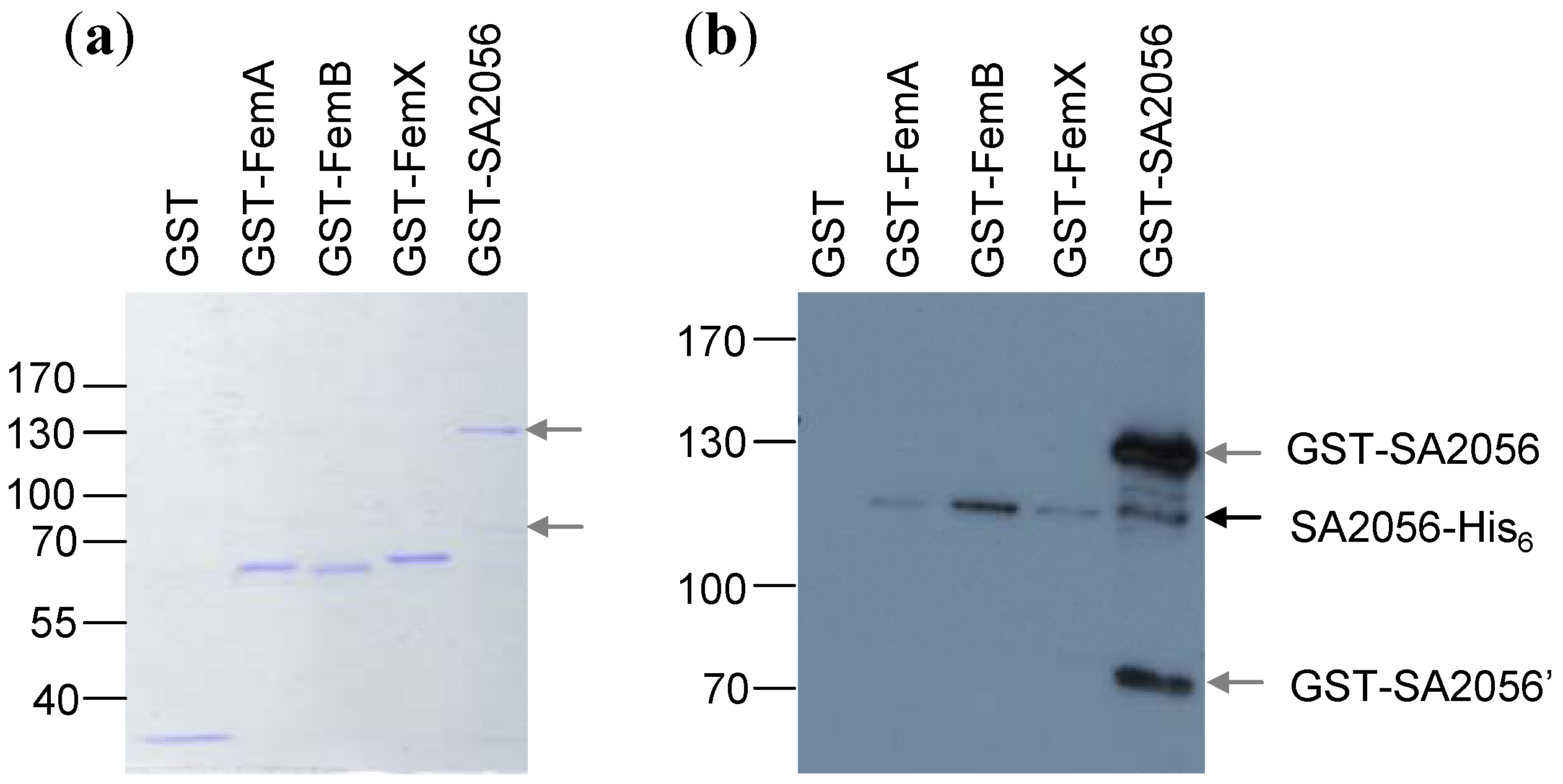 Pull-down experiments. Recombinant glutathion-S-transferase (GST)-tagged SA2056 and FemABX proteins were incubated with SA2056-His6 and aliquots of bound proteins were separated on denaturing polyacrylamide gels for Coomassie staining (a) or (b) transferred to a polyvinylidene fluoride (PVDF)-membrane for Western blot analysis using specific antibodies against SA2056. Relevant bands are indicated. GST (26 kDa), GST-FemA (74.1 kDa), GST-FemB (74 kDa), GST-FemX (74.3 kDa), SA2056-His6 (115 kDa). Probably due to degradation, an additional band (~70 kDa; GST-SA2056’) was visible in the preparation of GST-SA2056 (147.2 kDa) and detected with the antibodies. For appropriate separation, a 10%-(a) and a 7.5%-polyacrylamide gel (b) were used. GST-tagged proteins had a tendency to run slightly faster than expected from their predicted mass.