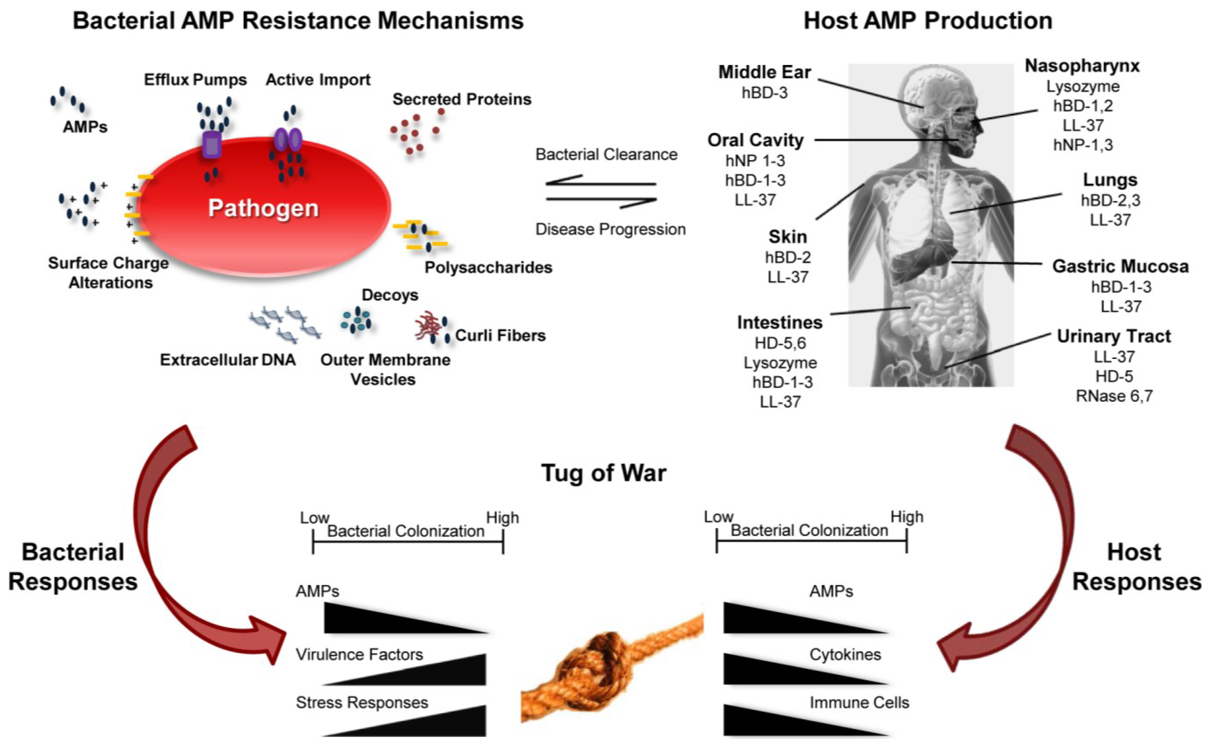 Summary of host-pathogen interaction as a consequence of AMP function. Bacterial AMP resistance mechanisms provide advantages to pathogens (upper left) leading to disease progression. The host produces AMPs to control bacterial growth leading to bacterial clearance (upper right). AMPs modulate gene expression by both host and pathogen resulting in a tug of war to shift the balance between health and disease.
