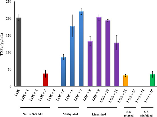 PG-1 analogs neutralized meningococcal LOS activity and inhibited TNFα release. TNFα was released from human macrophage-like THP-1 cells induced overnight with meningococcal LOS (5 ng/mL ~ 2.5 pmole/mL) preincubated with or without 2 µg/mL of PG-1 or its derivatives for 30 min at 37 °C. TNFα release was measured by ELISA. Error bars represent ±SD from the mean of duplicate measurements. This experiment is representative of two independent experiments. Methylated: N-methylated tyrosine or phenylalanine derivatives; S-S: disulfide bridges.