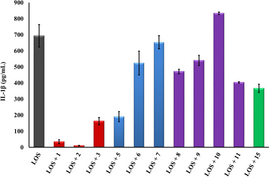 PG-1 analogs neutralized meningococcal LOS activity and inhibited IL-1β release. IL-1β was released from human macrophage-like THP-1 cells induced overnight with meningococcal LOS (5 ng/mL ~ 2.5 pmole/mL) preincubated with or without 2 µg/mL of PG-1 or its derivatives for 30 min at 37 °C. IL-1β release was measured by ELISA. Error bars represent ±SD from the mean of duplicate measurements. This experiment is representative of two independent experiments. Methylated: N-methylated tyrosine or phenylalanine derivatives; S-S: disulfide bridges.