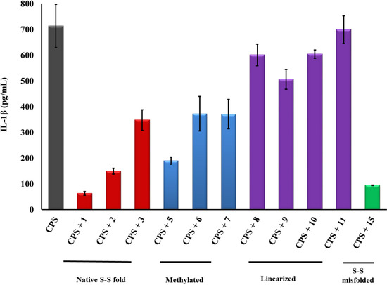 PG-1 analogs neutralized meningococcal capsular polysaccharide (CPS) polymers activity and inhibited IL-1β release. CPS polymers were purified from the endotoxin-deficient serogroup B meningococcal NMB-lpxA mutant designated CPS. IL-1β was released from human macrophage-like THP-1 cells induced overnight with meningococcal CPS polymers (25 µg/mL) pre-incubated with or without 2 µg/mL of PG-1 or its derivatives for 30 min at 37 °C. IL-1β release was measured by ELISA. Error bars represent ±SD from the mean of duplicate measurements. This experiment is representative of two independent experiments. Methylated: N-methylated tyrosine or phenylalanine derivatives; S–S: disulfide bridges.