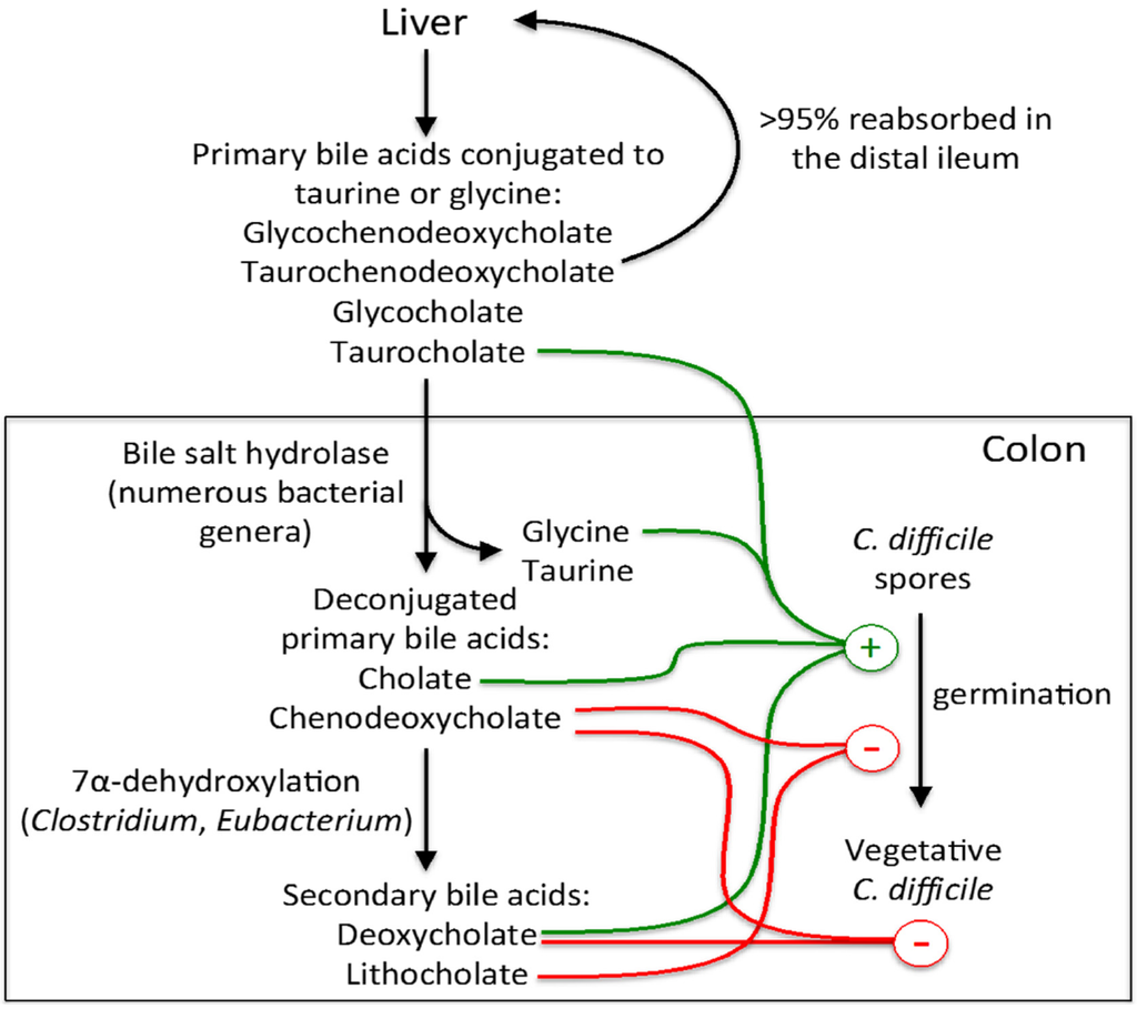 The primary bile acids produced by the human liver consist mainly of cholate and chenodeoxycholate, which are typically conjugated to either taurine (e.g., taurocholate) or glycine (Figure 1). The fraction of secreted bile acids that is not reabsorbed in the distal ileum (<5%) passes into the colon, where they undergo bacterial metabolism []. A broad spectrum of intestinal bacteria has the ability to deconjugate primary bile acids and a minor fraction of the microbiota can further metabolize them into secondary bile acids, such as lithocholate and deoxycholate [,]. In vitro studies have shown that the conjugated and deconjugated forms of cholate, along with the amino acid glycine, act together to induce the germination of C. difficile spores, whereas chenodeoxycholate is a potent inhibitor of spore germination [,]. The secondary bile acid lithocholate inhibits germination, whereas deoxycholate promotes spore germination but is toxic for vegetative C. difficile and therefore inhibits its growth [,]. Under normal physiological conditions, chenodeoxycholate competitively inhibits taurocholate-mediated spore germination in the gut and also prevents C. difficile vegetative growth, as does deoxycholate [,,]. However, when the intestinal microbiota is disrupted by antibiotics, primary bile acids are no longer transformed into secondary bile acids and an increase in the ratio of cholate to chenodeoxycholate derivatives, due to a more rapid absorption of the latter by the colonic epithelium, may promote the germination and growth of C. difficile []. Recently, Buffie et al. found that Clostridium scindens, a bile acid 7α-hydroxylating bacterium, displayed strong inhibition against C. difficile in the intestinal microbiota of antibiotic-treated mice and humans []. The 7α-hydroxylation activity is involved in the conversion of primary bile acids into secondary bile acids and is possessed by a limited number of intestinal species among the Clostridium and Eubacterium genera []. Administration of C. scindens to antibiotic-exposed animals enhanced resistance to CDI in a secondary bile acid dependent manner. Although these findings remain to be validated in human populations, they do lay the groundwork for the elaboration of targeted, microbiome-based interventions to prevent and treat CDI in high-risk individuals.