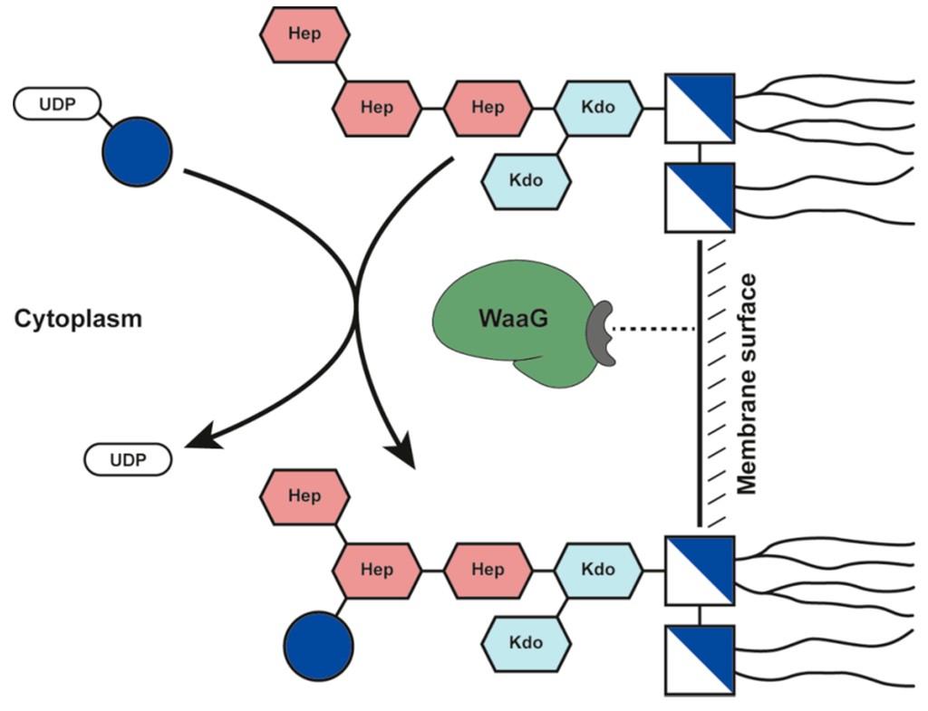 Schematic of the action of the glycosyltransferase WaaG transferring a d-glucose residue (blue ball) from UDP-glucose to heptose-II of the inner core of an LPS molecule.