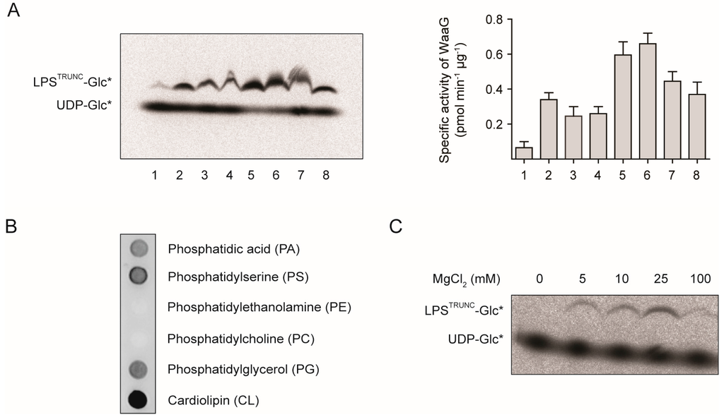 His-WaaG activity under different lipid compositions. (A) Mixed micelles containing CHAPS and/or various lipids were incubated with LPSTRUNC (0.5 µg·mL−1), UDP-Glc* and His-WaaG (0.1 mg·mL−1) to monitor LPS-glycosylation. After 1 h, the reaction was stopped by the addition of Laemmli buffer, and the products were separated by SDS-PAGE and detected by digital autoradiography. Lane 1: no added lipids or detergents; Lane 2: 20 mM CHAPS; Lane 3: 10 mM PG; Lane 4: 5 mM CL; Lane 5: 20 mM CHAPS + 10 mM PG; Lane 6: 20 mM CHAPS + 10 mM PG + 1 mM CL; Lane 7: 20 mM CHAPS + 10 mM PG + 5 mM CL; Lane 8: 3% DHPC. Quantification of LPSTRUNC-Glc* and UDP-Glc* was performed with ImageJ and the specific activity calculated (see the Experimental Section). Specific activities plotted as the mean ± SD; n = 2. (B) Nitrocellulose membranes containing immobilized lipids (100 pmol/spot) were incubated with purified His-WaaG (3 µg·mL−1). After washing to remove unbound protein, His-WaaG that bound to different lipids was detected by immunoblotting with antisera to the His-tag. (C) His-WaaG activity was monitored in vitro with different concentrations of MgCl2.