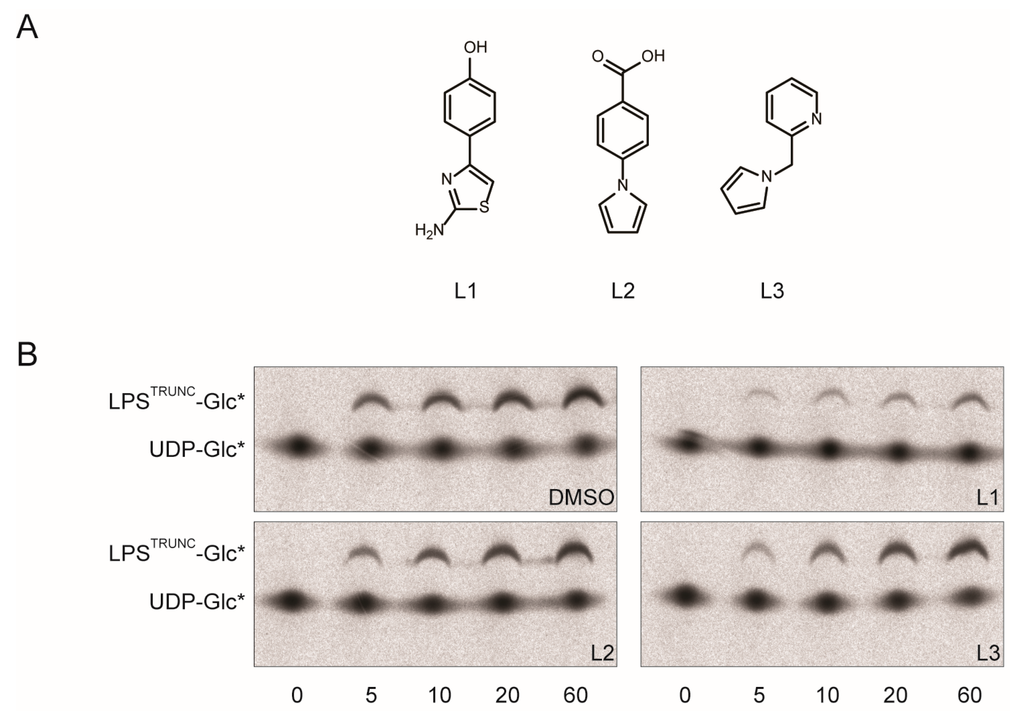 Previously, we identified three small molecular scaffolds that bind to WaaG in vitro (Figure 3A) [17]. To determine if these molecular scaffolds were suitable for the development of an inhibitor, we added 25 mM of them to the in vitro assay and monitored the formation of LPSTRUNC-Glc* over time. When compound L1 (4-(2-amino-1,3-thiazol-4-yl)phenol) was added, we noted that it drastically reduced the amount of LPS-Glc* formed (Figure 3B, upper right panel; Figure 3C). In contrast, the fragment-based molecules L2 and L3 had no significant effect on the formation of LPSTRUNC-Glc* (Figure 3B, lower panels; Figure 3C).