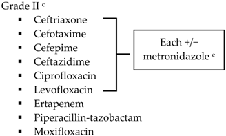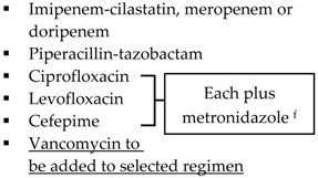 - Blot, S.; De Waele, J.J.; Vogelaers, D. Essentials for selecting antimicrobial therapy for intra-abdominal infections. Drugs 2012, 72, e17–e32. [Google Scholar] [CrossRef] [PubMed]
