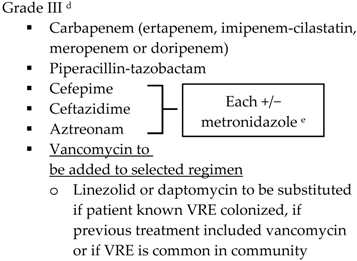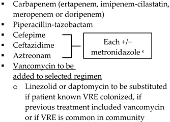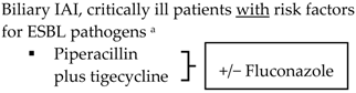 | Community-acquired | ![]() | Biliary IAI, critically ill patients with no risk factors for ESBL pathogens a