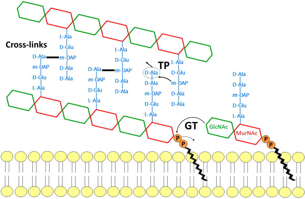 Peptidoglycan (PG) is an essential macromolecular sacculus surrounding most bacteria. PG determines the bacterium cell shape and provides protection from rupture under the high cytoplasmic osmotic pressure [1]. The PG structure consists of glycan strands made of alternating β-1,4-linked N-acetylglucosamine (GlcNAc) and N-acetylmuramic acid (MurNAc) residues cross-linked by peptides [1]. Nascent glycan strands are first polymerized by the glycosyltransferases (GTs) using the lipid II precursor (undecaprenyl-pyrophosphoryl-MurNAc-(pentapeptide)-GlcNAc) as a substrate [2,3], and cross-linked between them and with the pre-existing cell wall by the penicillin-binding proteins (PBPs)/transpeptidases (TPs) (Figure 1) [4,5]. The activities and regulation of GTs and TPs are coupled to provide a concerted knitting and enlargement of the PG sacculus [6,7,8,9,10].