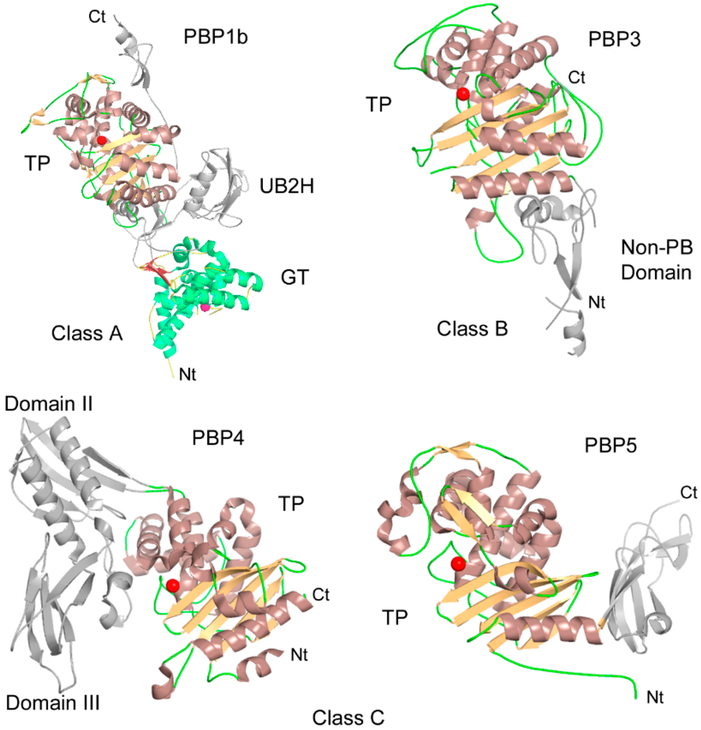 Structure of E. coli class A PBP1b [34], class B PBP3 [32], class C PBP4 [35], and class C PBP5 [36]. The TP domains are shown with brown helices and orange strands, the red sphere indicating the position of the active site serine. The PBP1b GT domain is shown with helices colored in lime green and strands in brick color. The GT catalytic centre (Glu233) is shown with a pink sphere.