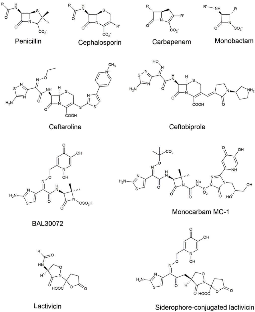 Commercially available inhibitors of PBPs almost exclusively contain the four-membered β-lactam ring (Figure 3). Penicillins, cephalosporins, monobactams and carbapenems have been developed from natural representatives and, except for penicillin derivatives, research continues in an ongoing process to find new compounds active against the most harmful bacteria. The β-lactam antibiotics take advantage of their structural similarity to the d-Ala-d-Ala moiety of the natural substrate to lure the PBP [56].