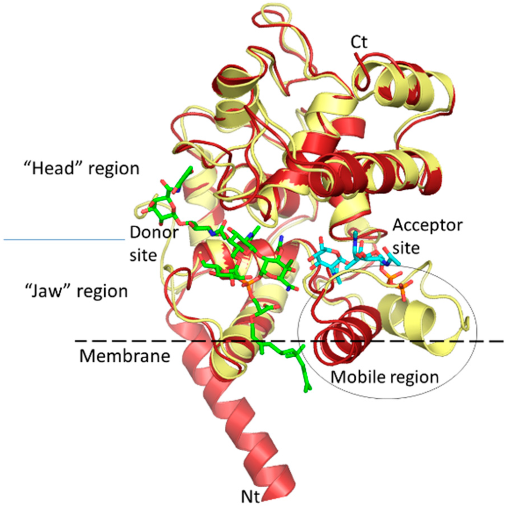 Superimposition of two structures of S. aureus MtgA, PDB 3VMR (yellow) and PDB 3HZS (red). Moenomycin (green) bound to the donor site and a lipid II analog (cyan) bound to the acceptor site are represented in stick. The mobile region between the two sites is highlighted by a circle.