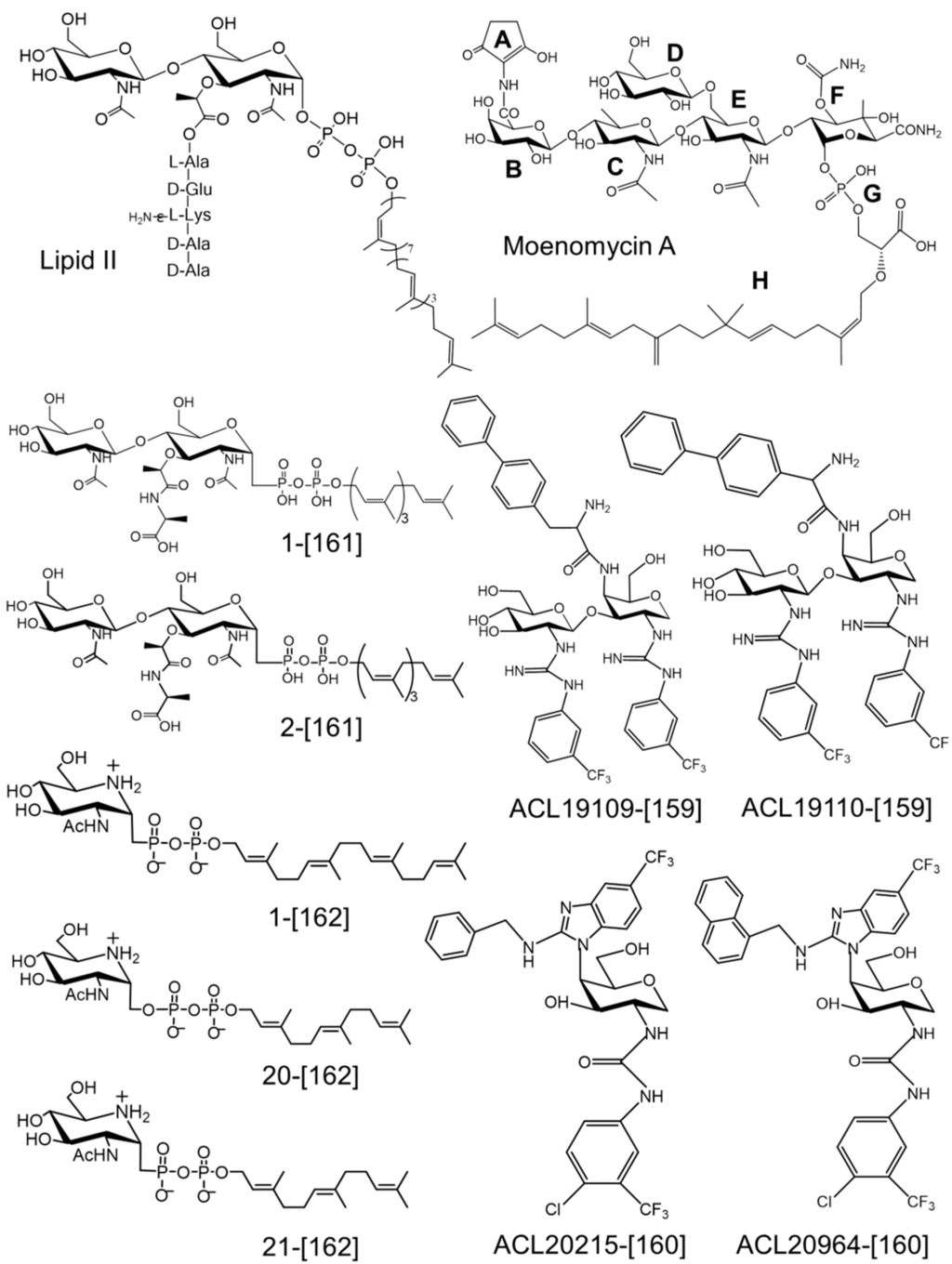 Structures of the lipid II substrate and the glycosyltransferase inhibitor moenomycin A and their recent synthetic analogs shown to inhibit GT activity. The compounds are numbered as in the original papers and the references are indicated in square brackets.