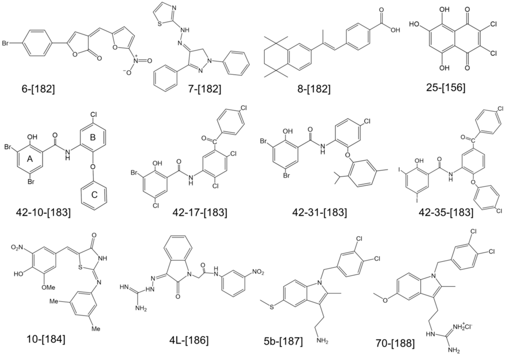 Alternative binding assays that do not rely on lipid II and are based on the displacement of fluorescently labeled moenomycin A (F-Moe) [182,183] or its analog [184] have been used to screen large collections of compounds. A fluorescence anisotropy (FA)-based assay was developed using F-Moe to screen a 57,000 small molecule library (at a concentration of 50 µM) for interaction with full-length Helicobacter pylori PBP1a [182]. Eleven hits were initially identified, among which three (6, 7, 8, Figure 6) were confirmed to bind to the GT (IC50 = 3–34 µM) and exhibit antibacterial activity against S. aureus (MIC > 4 µg/mL). Confirmation with lipid II was not reported in this study. In another study [183], cell-based HTS was first performed on a library with two million compound to search for MRSA inhibitors. The positive hits (252 with MIC values against MRSA of 0.03–8 µg/mL) were then tested using the FA assay for competition with F-Moe binding to GT. Sixteen small molecules were identified, but after lipid II polymerization assays, only salicylanilide-based molecules (42–10 and 42–17, Figure 6) were confirmed to inhibit the GT activity in vitro (IC50 37 µM). Analogs of these compounds have been synthesized to evaluate their structure-activity relationship. The hydroxyls of ring A and the amide group (Figure 6) were found to be essential for GT inhibition. Salicylanilides with only rings A and B were inactive and the presence of an additional aromatic group on the aniline (ring B) was shown to be important for the inhibition of GT. Compounds (42–31 and 42–35, Figure 6) have good antibacterial activity (1–8 µg/mL) and inhibit the GT competitively with Ki values ranging between 5 and 28 µM depending on the enzymes used.