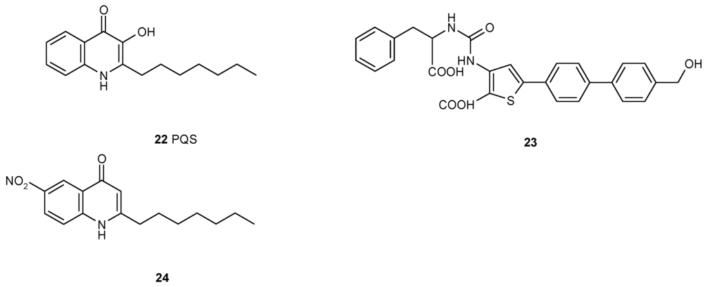 - Lu, C.; Kirsch, B.; Zimmer, C.; de Jong, J.C.; Henn, C.; Maurer, C.K.; Müsken, M.; Häussler, S.; Steinbach, A.; Hartmann, R.W. Discovery of antagonists of PqsR, a key player in 2-alkyl-4-quinolone-dependent quorum sensing in Pseudomonas aeruginosa. Chem. Biol. 2012, 19, 381–390. [Google Scholar] [CrossRef] [PubMed]