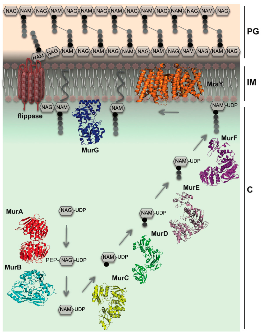 A simplified view of cytoplasmic and membrane-related steps of PG biosynthesis. The concerted action of MurA and MurB generates the initial precursor, UDP-N-acetyl muramic acid (UDP-NAM). Mur ligases (C–F) catalyze the stepwise addition of a pentapeptide to UDP-N-acetyl muramic acid (UDP-NAM). MraY anchors the UDP-NAM-pentapeptide unit to the inner membrane through an undecaprenyl phosphate carrier lipid, forming lipid I. MurG participates in the formation of the final peptidoglycan building block (Lipid II), which is then flipped to the periplasm by flippases. C: cytoplasm; IM: inner membrane; PG: peptidoglycan layer. Cytoskeletal elements are not shown for simplicity. PDB codes of molecules depicted here: MurA (1NAW); MurB (1MBT); MurC (1J6U); MurD (4BUC); MurE (4BUB); MurF (3ZL8); MurG (1F0K); MraY (4J72).