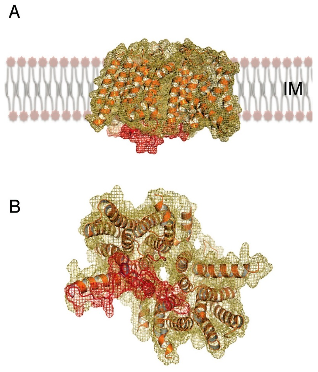 The crystal structure of MraY from Aquifex aeolicus (PDB 4J72) reveals (A) a dimer displaying 10 TM helices per monomer, whose N- and C-termini face the periplasm. (B) A view from the cytoplasmic side indicates a tunnel formed in the monomer-monomer interaction region, buttressed by cytoplasmic loops (in red) that could interact with substrate, partner proteins, or both.