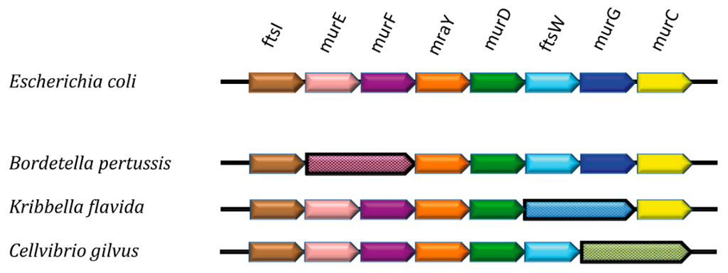 Schematic representation of a section of the dcw (division and cell wall) cluster in different bacterial genomes. Adjacent arrows represent contiguous genes involved in cell wall synthesis and division. In a number of species, adjacent genes are fused, such as in numerous strains of B. pertussis (murE/murF), and in the actinomycetes K. flavida (ftsW/murG) and C. gilvus (murG/murC).