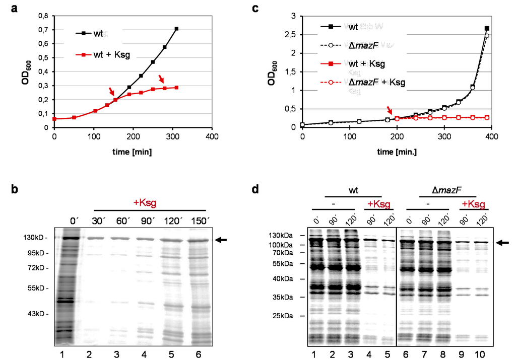 As shown before, the addition of Ksg results in the cessation of E. coli growth (Figure 1a) and the inhibition of protein synthesis (Figure 1b, lanes 2–3). However, pulse labeling experiments employing E. coli strain MG1655 harboring plasmid pRB381-1 [14], encoding the leaderless cI-lacZ fusion gene, revealed that translation of a leaderless reporter continued in the presence of 0.5 mg/mL Ksg (Figure 1b, lanes 2–6; [15]). Intriguingly, 90–120 min after addition of the antibiotic, we observed restored de novo translation of particular proteins (Figure 1b, lanes 4–6), which was resistant to Ksg even after retreatment of the cells with the antibiotic at time point 120 min (Figure 1b, lane 6). Considering the selective synthesis of proteins encoded by lmRNAs after induction of mazF together with the fact that antibiotic treatment can trigger the mazEF system [20,21] we hypothesized that Ksg treatment likewise results in activation of MazF. This would in turn lead to the formation of lmRNAs, which are selectively translated in the presence of Ksg. To test for this hypothesis we repeated the growth analysis using the isogenic mazF deletion mutant and performed pulse labeling upon addition of Ksg (Figure 1c,d). Surprisingly, the experiment revealed that despite the lack of MazF the same proteins are selectively synthesized after Ksg treatment (Figure 1d, lanes 4–5 and 9–10). This result indicates that MazF is not required for the specific protein synthesis in the presence of Ksg.