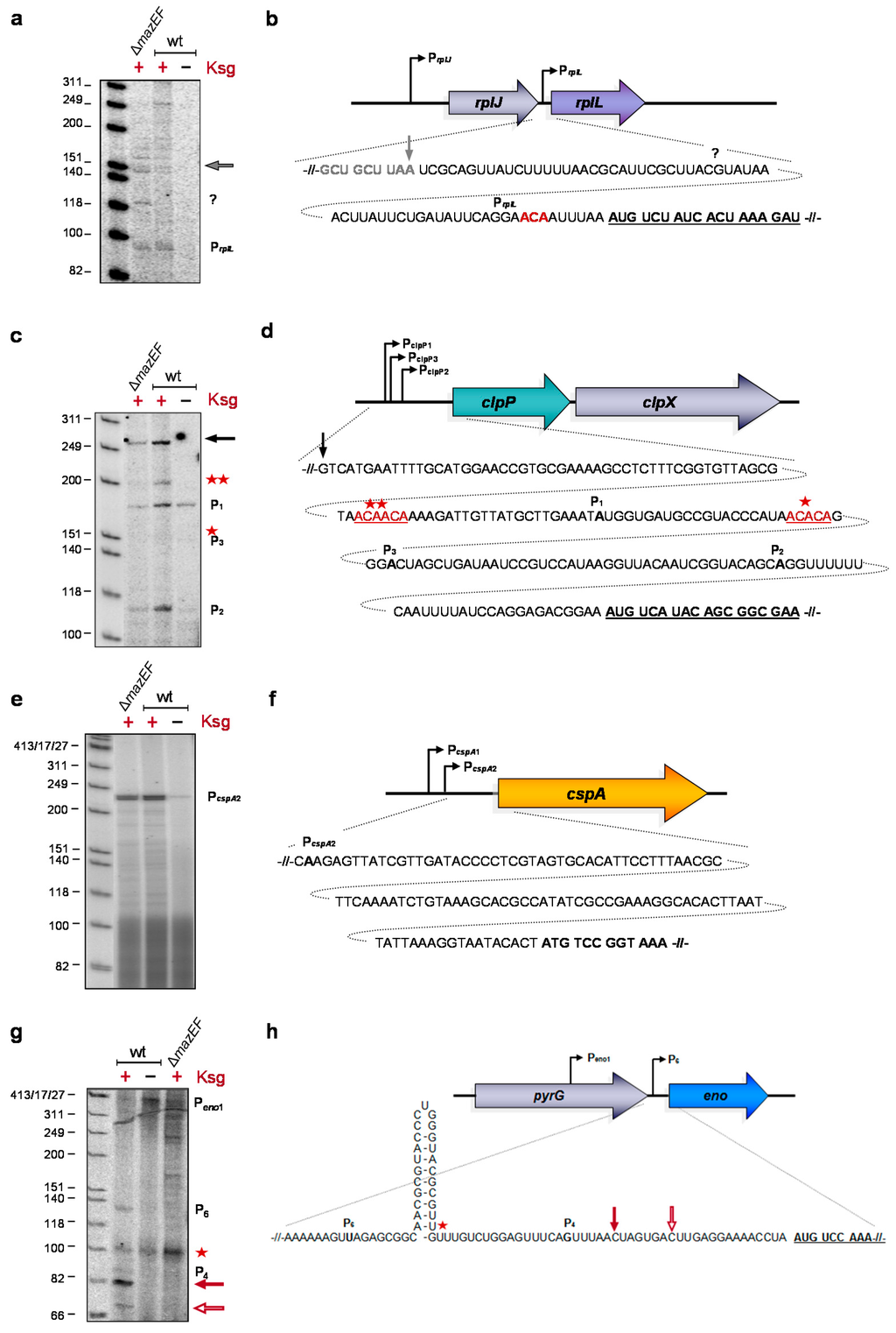 Determination of the 5′-terminus of the rplL (a and b), clpP (c and d), cspA (e and f), and eno (g and h) mRNAs by primer extension analysis. Total RNA was prepared from strain MG1655 before and 120 min after addition of Ksg. Likewise, total RNA was prepared from strain MG1655ΔmazF after treatment with Ksg for 120 min and used for the analysis. The analyses were performed in triplicate and one representative autoradiograph is shown. (b, d, f, and g) Schematic depictions of promoter positions and sequence of 5′-UTRs and proximal coding regions of the different RNAs are shown. Signals corresponding to transcriptional start sites and processing sites are indicted to the right of the primer extension analysis and in the depiction of the sequence. The lengths of the standard marker are given to the left.