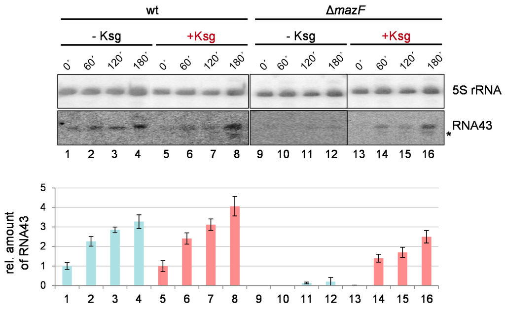 Formation of RNA43 upon Ksg treatment. Total RNA purified from strain MG1655 (lanes 1–8) and MG1655ΔmazF (lanes 9–16) at indicated time points without (lanes 1–4 and 9–12) or with the addition of Ksg (lanes 5–8 and 13–16) was subjected to northern blot analysis using probe V7, specific for the RNA43. A probe specific for the 5S rRNA was used as an internal control. The second signal observed after addition of Ksg is marked by an asterisk. The obtained RNA43 signal intensities were quantified and normalized using the 5S rRNA signals. In the graph below, the corresponding relative amounts of RNA43 are given Light blue and red bars indicate without or with Ksg treatment, respectively. The value obtained in strain MG1655 at time point 0’ (lane 1) was set to 1. The error bars represent the standard deviation of triplicate samples.