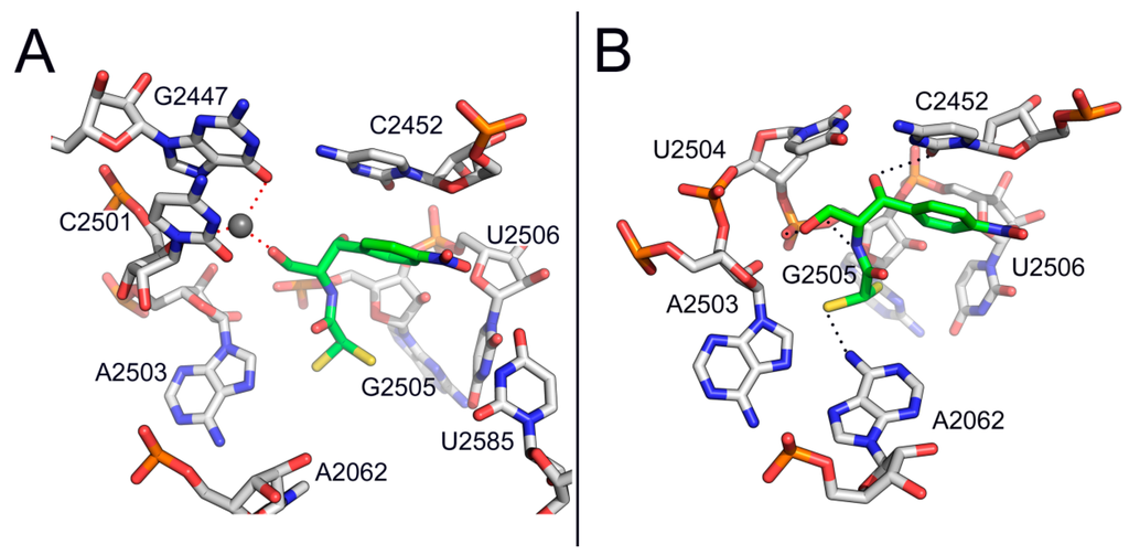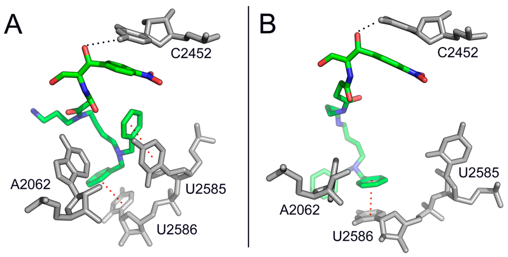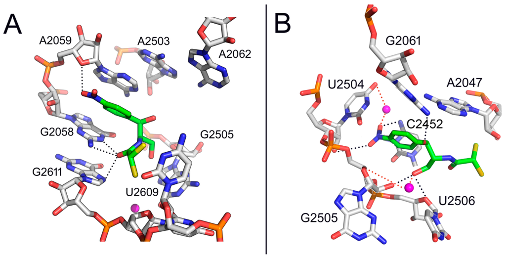 - Long, K.S.; Porse, B.T. A conserved chloramphenicol binding site at the entrance to the ribosomal peptide exit tunnel. Nucleic Acids Res. 2003, 31, 7208–7215. [Google Scholar] [CrossRef] [PubMed]