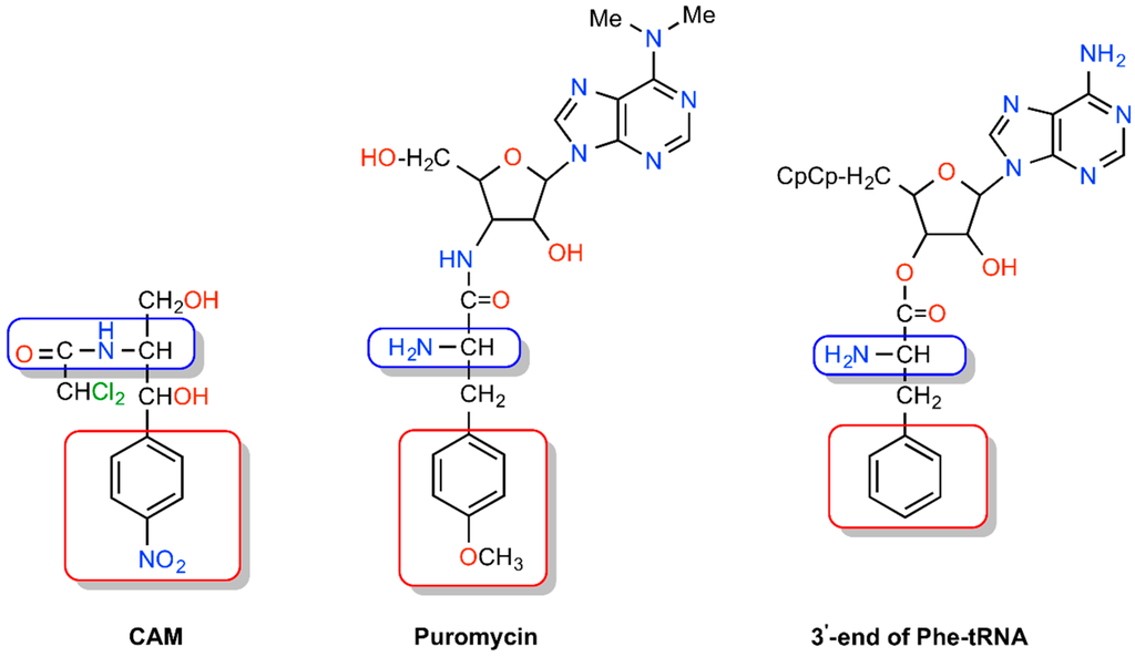 - Vince, R.; Almquist, R.C.; Ritter, C.L.; Daluge, S. Chloramphenicol binding site with analogues of chloramphenicol and puromycin. Antimicrob. Agents Chemother. 1975, 8, 439–443. [Google Scholar] [CrossRef] [PubMed]