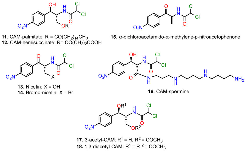 Dinos, G.P.; Athanassopoulos, C.M.; Missiri, D.A.; Giannopoulou, P.C.; Vlachogiannis, I.A.; Papadopoulos, G.E.; Papaioannou, D.; Kalpaxis, D.L. Chloramphenicol Derivatives as Antibacterial and Anticancer Agents: Historic Problems and Current Solutions. Antibiotics 2016, 5, 20. https://doi.org/10.3390/antibiotics5020020