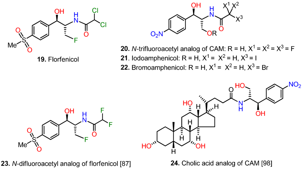 - Syriopoulou, V.P.; Harding, A.L.; Goldman, D.A.; Smith, A.L. In vitro antibacterial activity of fluorinated analogues of chloramphenicol and thiamphenicol. Antimicrob. Agents Chemother. 1981, 19, 294–297. [Google Scholar] [CrossRef] [PubMed]