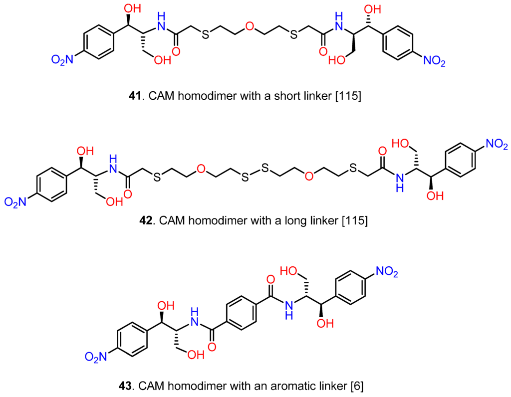 - Kostopoulou, O.N.; Magoulas, G.E.; Papadopoulos, G.E.; Mouzaki, A.; Dinos, G.P.; Papaioannou, D.; Kalpaxis, D.L. Synthesis and evaluation of chloramphenicol homodimers: Molecular target, antimicrobial activity, and toxicity against human cells. PLoS ONE 2015, 10, e0134526. [Google Scholar] [CrossRef] [PubMed]