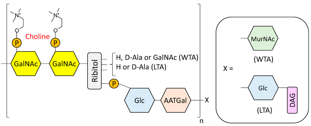 Structural model of pneumococcal cell wall teichoic (WTA) and lipoteichoic (LTA) acids according to Seo et al. [] and subsequently refined by Gisch et al. []. GalNAc, N-acetylgalactosamine; P, phosphate group; Glc, glucose; AATGal, 2-acetamido-4-amino-2,4,6-trideoxygalactose; MurNAc, N-acetylmuramic acid; DAG, diacylglycerol.