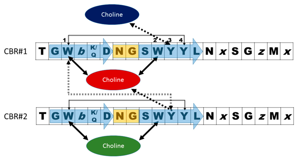 Scheme of a standard pneumococcal choline-binding site configured by two consecutive CBRs with the consensus sequence deduced by Jalview [,]. b is a hydrophobic residue, z has a small side chain and x may be any residue. The blue arrows and orange rectangle indicate the strand-turn-strand configuration of the β-hairpin. Black, solid arrows show the cation-π interactions with choline. Grey arrows indicate stabilizing π-π stacking between aromatic side chains. Dashed arrows denote a contact that may be found either as cation-π or π-π types. Numbers indicate the situation of aromatic residues in the repeat.