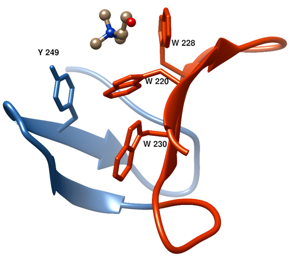 The first and second aromatic residues in the repeat #1, usually tryptophans, are disposed in right angle and establish cation–π interactions with choline. (Figure 4). The third aromatic from the repeat #2, normally a tyrosine, is sometimes found establishing an additional cation-π interaction with the ligand, although in many occasions this interaction is lacking and, instead, this residue interacts with the first tryptophan of repeat #1 through a T-shaped π-π stacking, as it is shown in Figure 4. Remarkably, a fourth aromatic residue within the hairpin is invariably found establishing a T-shaped π-π stacking with the first aromatic side chain located at the bottom of the binding pocket, (Figure 3 and Figure 4). This interaction has been generally overlooked in the structural analyses of CBPs despite its highly stabilizing nature [], which might be decisive to consolidate the rigid architecture of the site. The set of interactions is usually completed with the eventual participation of a hydrophobic side chain from the C-terminal part of the repeat. Very diverse choline-binding affinities have been described for different CBPs in spite of the conservation of the overall geometry of the standard binding sites among all members. Altogether, these data suggest that the interactions between choline in the cell wall and the choline-binding sites comprise the existence of a complex interplay of forces, especially of the π-π and cation-π type, very sensible to subtle differences []. Finally, despite their small size, CBRs behave as highly autonomous folding units, since the central β-hairpin of a single repeat is able to acquire its native structure in solution in the absence of the rest of the protein and to recognize choline and choline analogues, albeit with residual affinity [,].