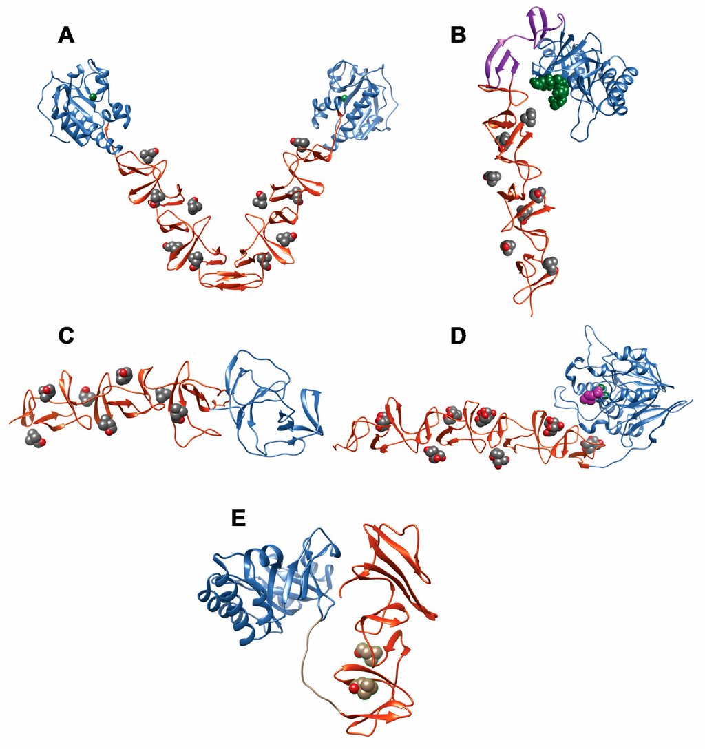 Three-dimensional structures of complete or nearly complete CBPs. The FM and CBM modules are colored blue and orange, respectively, and ligands are shown in van der Waals representation. (a) LytA amidase (PDB code: 4X36); the Zn2+ ion is colored green and the choline ligand is shown in CPK color scheme; (b) LytC lysozyme (PDB code: 2WWD); the NI and NII domains within the CBM are colored orange and magenta, respectively; choline is CPK colored; the PG fragment N-acetylmuramyl-l-alanyl-d-isoglutamine is shown in green; (c) CbpF protein (PDB code: 2V04); choline is CPK colored; (d) Pce cholinesterase withouth the C-terminal 85-aa tail (PDB code: 2BIB); phosphocholine bound in the active site is shown in magenta, and the Zn2+ ions are colored green; bis-tris molecules (in CPK scheme) occupy the choline-binding sites; (e) CPL1 lysozyme bound to choline (PDB code: 1OBA).