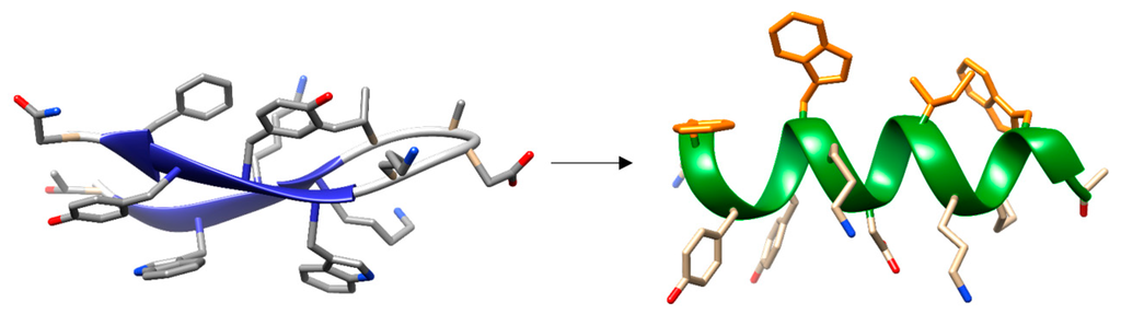 Micelle-induced conformational change of the isolated β-hairpin corresponding to the LytA 239-252 sequence. Non-polar residues in one face of the α-helical structure are colored orange to show the amphipathycity of the helix.