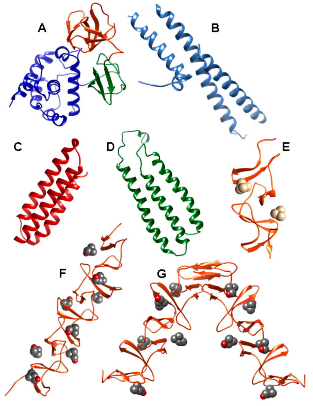 Three-dimensional structures of isolated domains from CBPs. (a) Functional module of LytB N-acetylglucosaminidase (PDB code: 4Q2W) (LytBCAT) depicting the SH3b, WW and GH73 domains in orange, green and blue respectively; (b) Lactoferrin-binding domain of PspA (PDB code: 2PMS); (c) CbpAN domain of PspC (PDB code: 2M6U); (d) R2 domain of PspC (PDB code: 1W9R); (e) Choline-binding module of CbpM (PDB code: 3HIA) containing N,N,N,N-tetramethylammonium in the binding sites; (f) Choline-binding module of CbpM (PDB code: 4CNL) bound to choline; (g) CBM module of prophage LytA (SPH_0121) (PDB code: 4IWT) in the presence of choline.