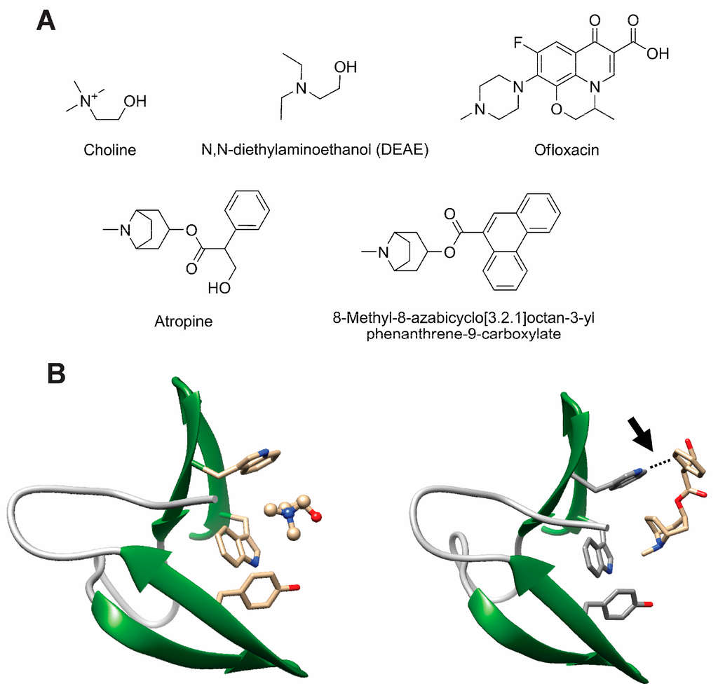 Structure of representative choline analogs that bind to CBPs. (a) Chemical formulae of representative compounds; (b) Comparison of the same choline-binding site in CbpF occupied by choline (left, PDB code: 2V04) or by atropine (right, PDB code: 2X8P); the arrow indicates the additional π-π interaction that provides high stability to CBP-EBA complexes.