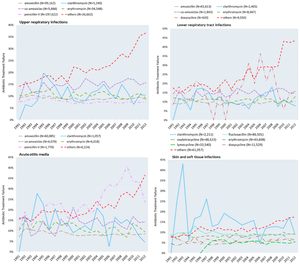 - Currie, C.J.; Berni, E.; Jenkins-Jones, S.; Poole, C.D.; Ouwens, M.; Driessen, S.; de Voogd, H.; Butler, C.C.; Morgan, C.L. Antibiotic treatment failure in four common infections in UK primary care 1991–2012: Longitudinal analysis. BMJ 2014, 349, g5493. [Google Scholar] [CrossRef] [PubMed]